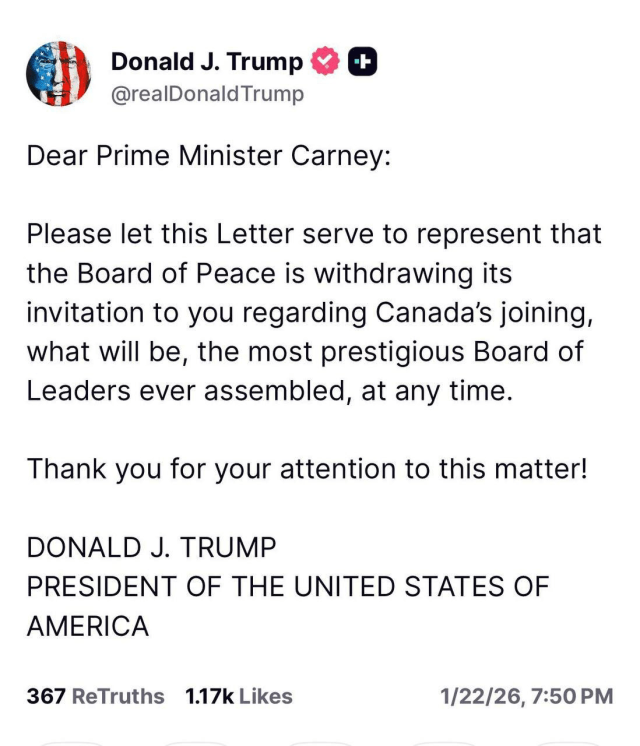 Trump withdrew Canada’s invitation to the “Peace Council.”