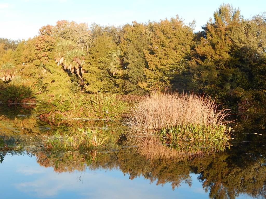 Green Cay Wetlands are thoughtfully provided with native marsh plants, grasses, shrubs, and trees for the marsh and associated hammocks (sheltered place). Queen palms and palmetto palms, Red Maple, Live Oak, and associated shrubs and vines make up the hammocks and surrounding hedges / edgings to the wetlands. There is quite a bit of road noise at the wetlands due to its being close to the Florida Turnpike and busy Hagen Ranch Road.