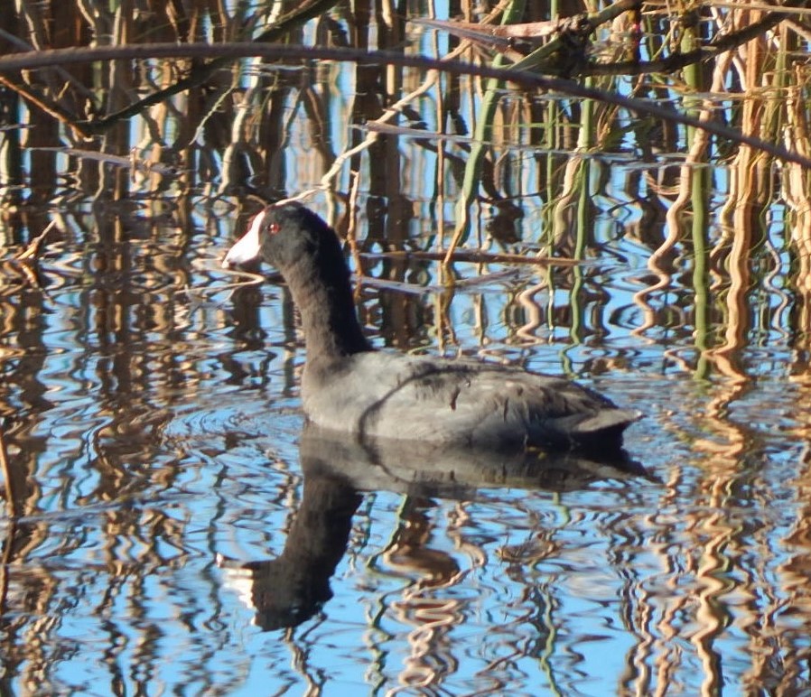 The wetlands have both Coots and Moorhens. The Common Coots are winter visitors. The Moorhens live in Florida all year. I know; I see them on a daily basis in the canal near my house. You can tell these two species by their beaks. The Moorhens or Dusky moorhen, Gallinula tenebrosa, have an orange beak; the Coot, a white beak. The Moorhens are probably more common than the Coots at least in SE Florida. Moorhens are also noisy little birds and protective parents.