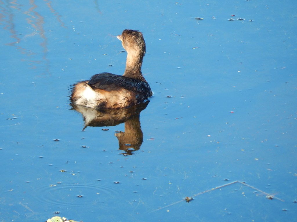 The grebes are adorable, small birds. When they are hunting for a meal, they tip over headfirst into the water. You can see the grebe above is quite wet, but unlike the Anhingas, they do not require a drying off period between dips.