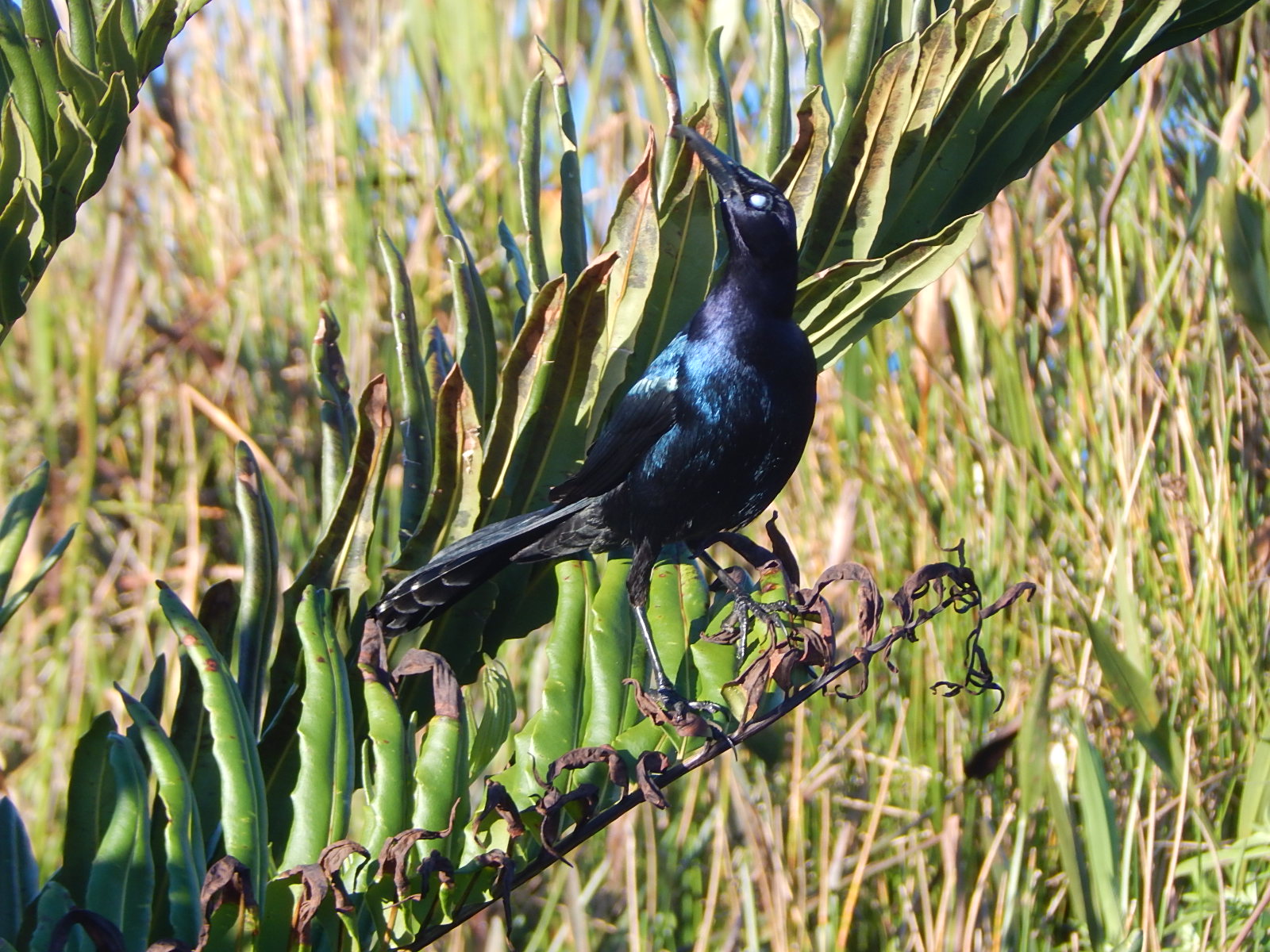 The male Grackle was singing a song and fluffing his feathers to attract a nearby female… who was hiding in the fern below. There were rival Grackle bachelors posing, preening and singing. Breeding time for these birds is winter… unlike the rest of North America!