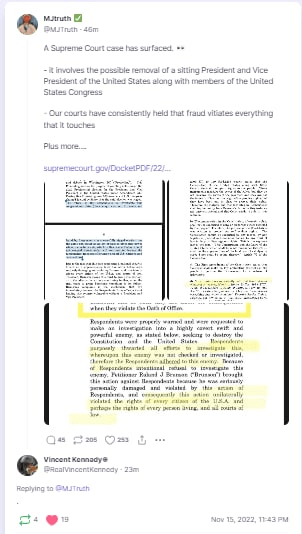 I listened to about 15 minutes of DJT’s speech last night and knew the plan was not quite ended… there is still a lot to tackle ahead of us, a lot to endure. With this announcement of his candidancy, DJT has effectively blocked any attempts by the [DS] to arrest him. Secondly, a new Supreme Court case has been placed on the docket… something to do with treason and listing Biden, Harris, Pence, and several members of Congress for allowing the fraudulent 2020 election to be certified… Oh, my. Then, DJT mentioned NESARA briefly. OBTW, new elections are required to take place 120 days after the announcement — meaning the current fake government just had their collective roots removed. There are a lot of things that still have to play out.
