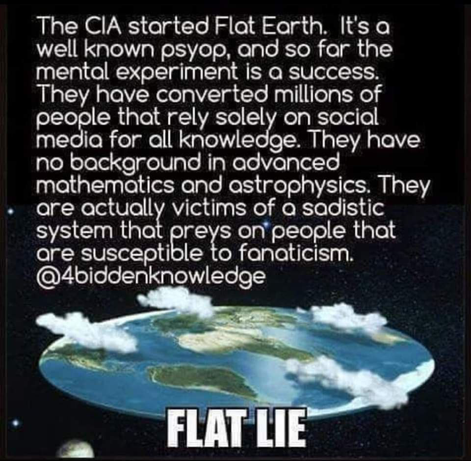 “Flat Earth is a psychological experiment elaborated by the CIA in order to distract and dumb down the population.” (Source)