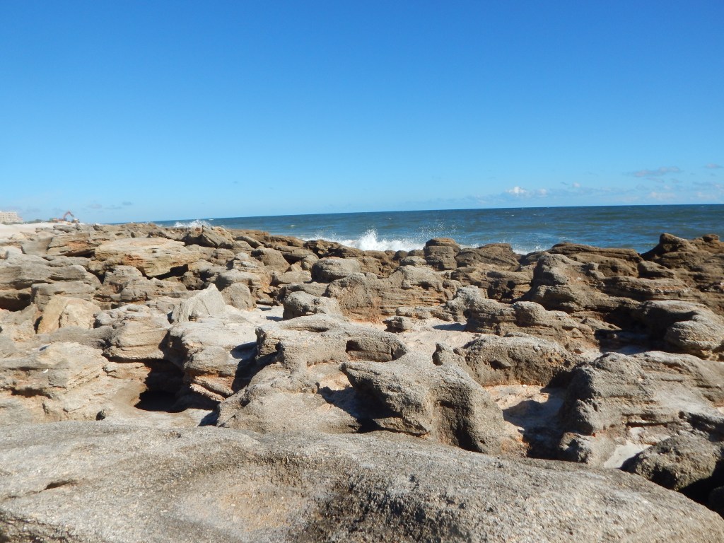 The other day, I visited Washington Oaks Garden SP, again. This time I visited the beach, walking to the coquina rocks and back again. The tide was incoming, the waves stiff and washing the coarse orangish sand. Coquina is a sort of limestone made up of tiny compacted shells. This rough substance was used to construct some of the earliest buildings in Florida, those made by white settlers. Some of these buildings still remain and can be found in places throughout this coatline.