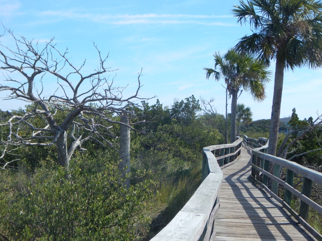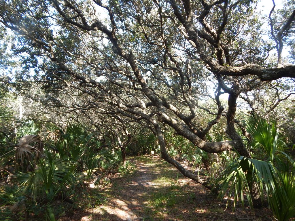 On Monday, I drove through the colorful seaside town of Flagler Beach and continued on to Gamble Rogers Memorial State Park, which sits just south of FB city limits. There is a dock for people boating on the Intracoastal, a fishing pier, trailer camping, and a short Nature Trail. I hiked around the nature trail through more of the hammock I had encountered at North Peninsula SP. I learned the names of the primary trees that grow in these hammocks (shady place): Sand Oak, Eastern Red Cedar, Red Bay, Magnolia grandiflora, Sabal Palm (Cabbage Palm) and sometimes Red Maple or Silver Maple. The undergrowth is a confusion of vines and shrubs, with Saw Palmetto dominating. I haven’t learned all the shrub names yet.