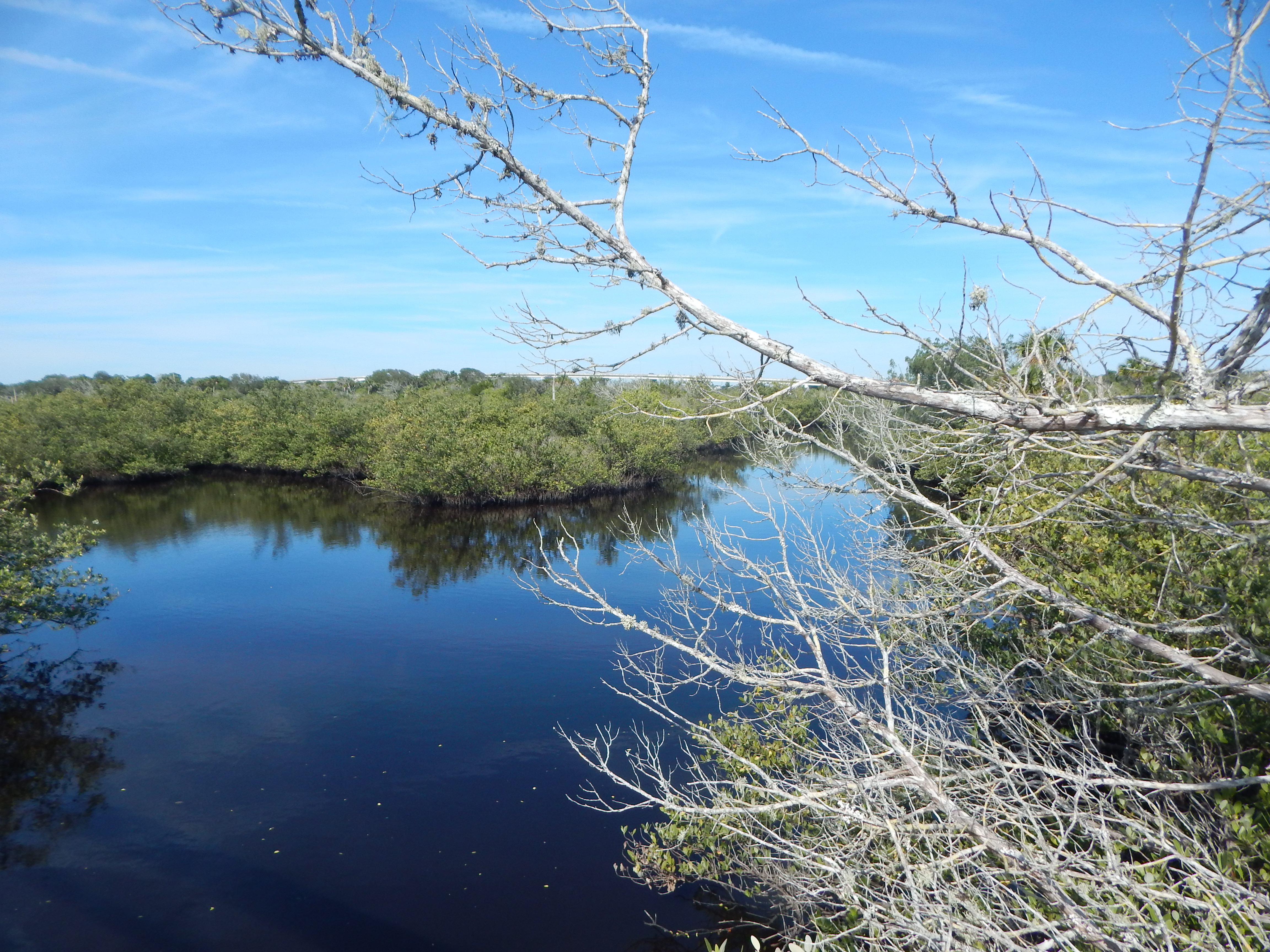 The Betty Steflik Nature Preserve is primarily boardwalk, crossing shallow inlets lined with mangrove and the occasional red cedar or Yaupon holly. There are some some islands in the midst of the preserve. There you will find Eastern Red Cedar, Red Bay, and Sand Oaks as the predominate trees. The walk continues to a boat launch and bathrooms, situated beneath the SR 100 bridge which looms above.