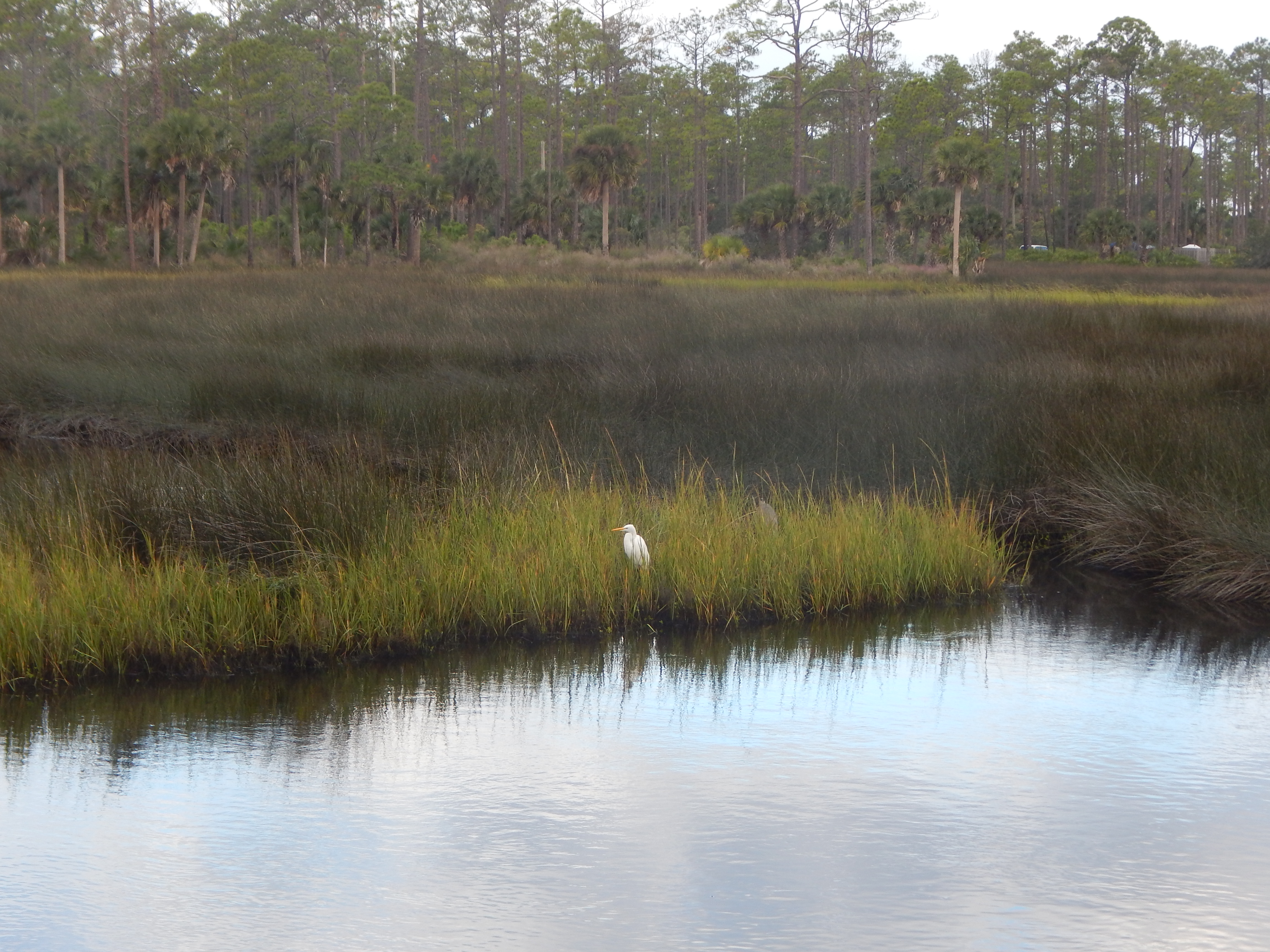 When I arrived back at the car, I walked over to the edge of Stiles Creek and sat at the picnic table. Then I noticed I had some company. A small heron was perched in a half-dead oak tree clinging to the edge of the creek. The bird was slightly hunched as the breeze stirred its feathers. It was aware of my presence but appeared unafraid. We just sat there quietly admiring the view for a while. Periodically, I could also see and hear the pair of Osprey that have been nesting near Stiles Creek for years. They were flying above the tall slender Slash Pine on the edge of the creek.