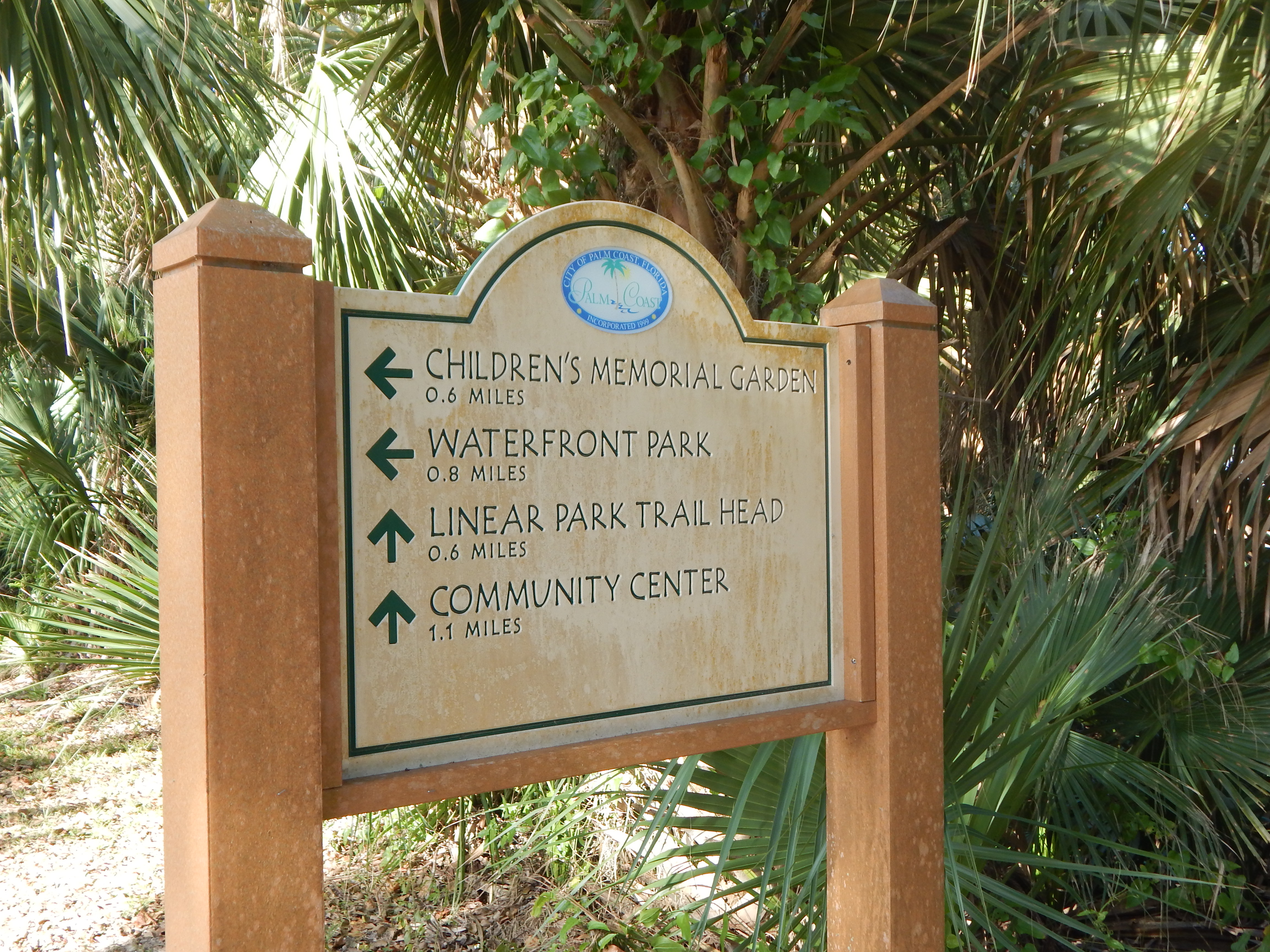 Today I chose another close-by trail, starting at Waterfront Park and following the Intracoastal Waterway north to Linear Park, all the way to beneath the Palm Coast Parkway Bridge. The trail is completely paved, partially shaded, and has provided benches, picnic tables, bike repair/air stations, and a restroom at Waterfront Park. There is also a play area at the park for children. Along the path (about .4 miles in, there is the Children’s Memorial Park, where plaques have been placed in memory of family members.