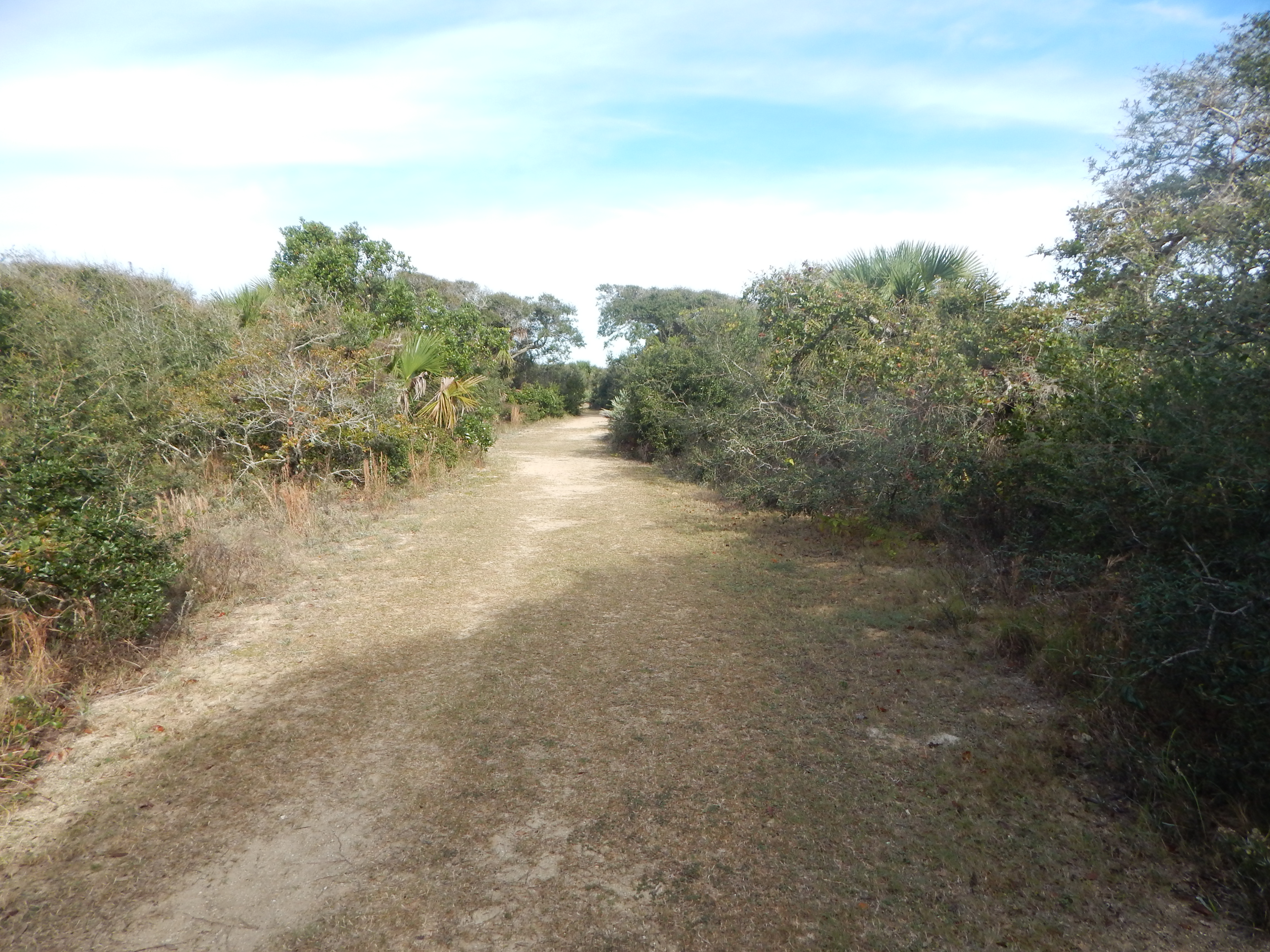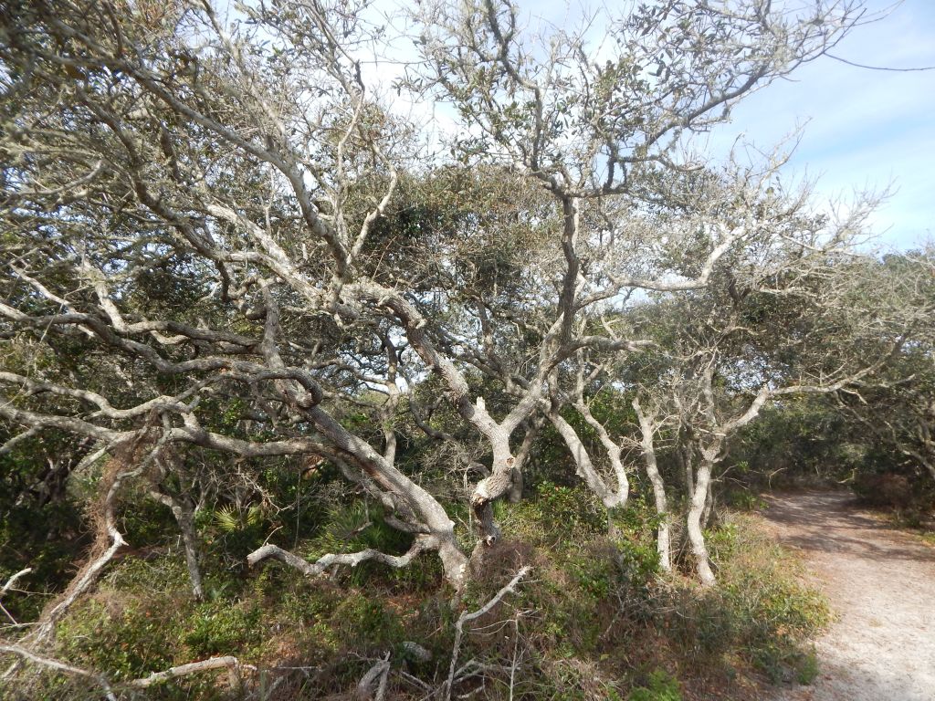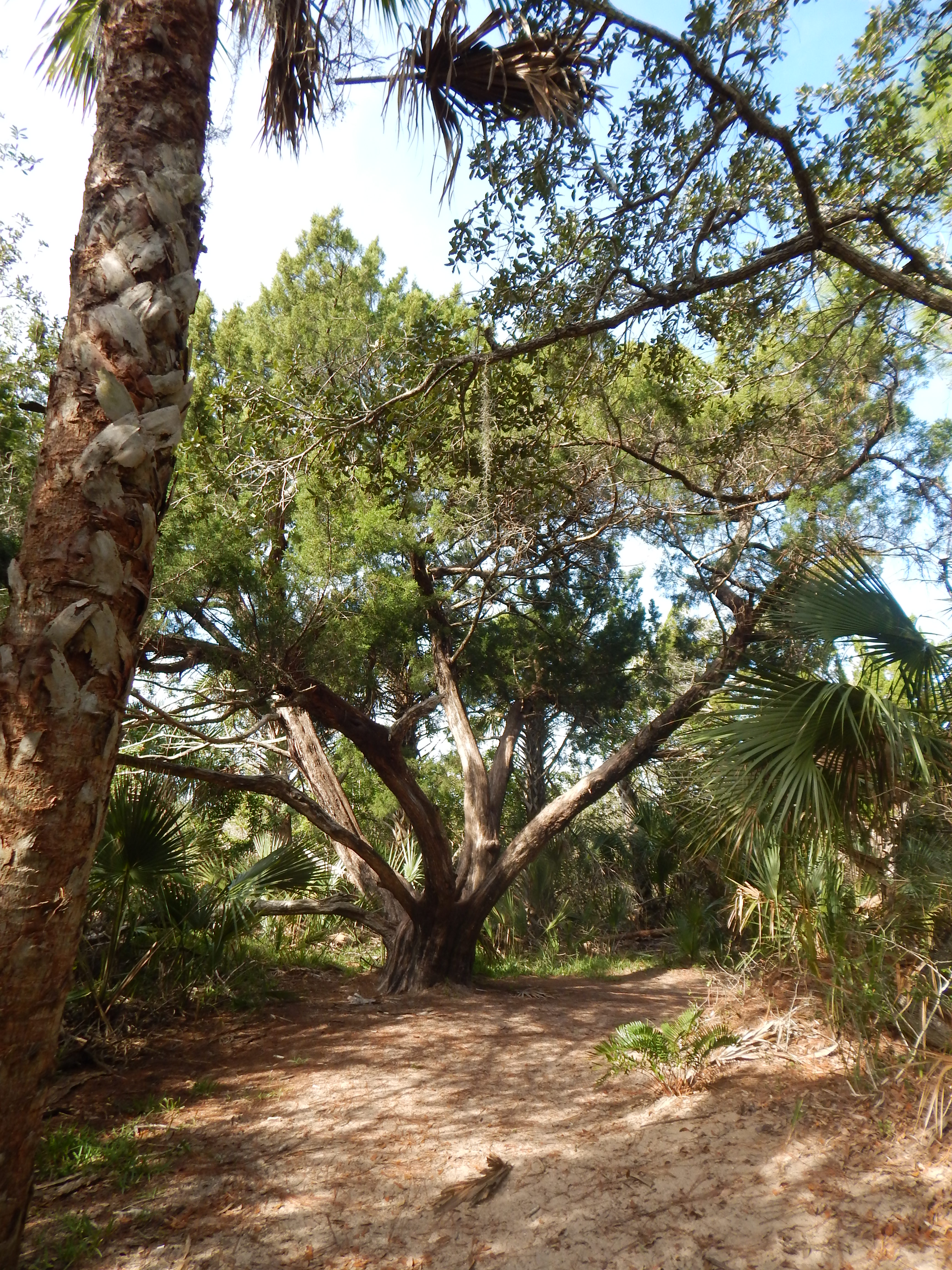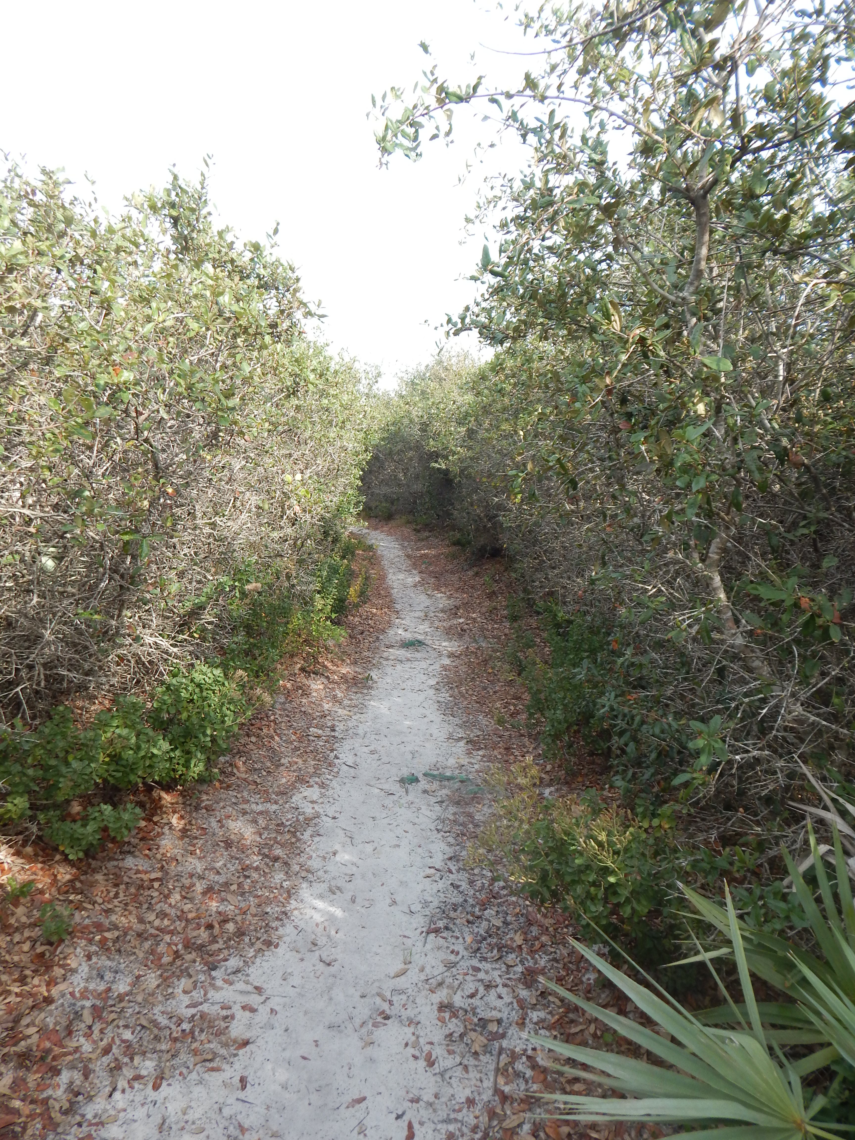 The trail winds in and out of shaded hammock and then enters a section of coastal scrub, creating a narrow tunnel. Even though the coastline is merely a quarter mile away, you cannot glimpse the ocean from the highest section of the trail due to the height of the surrounding shrubs and stunted trees.