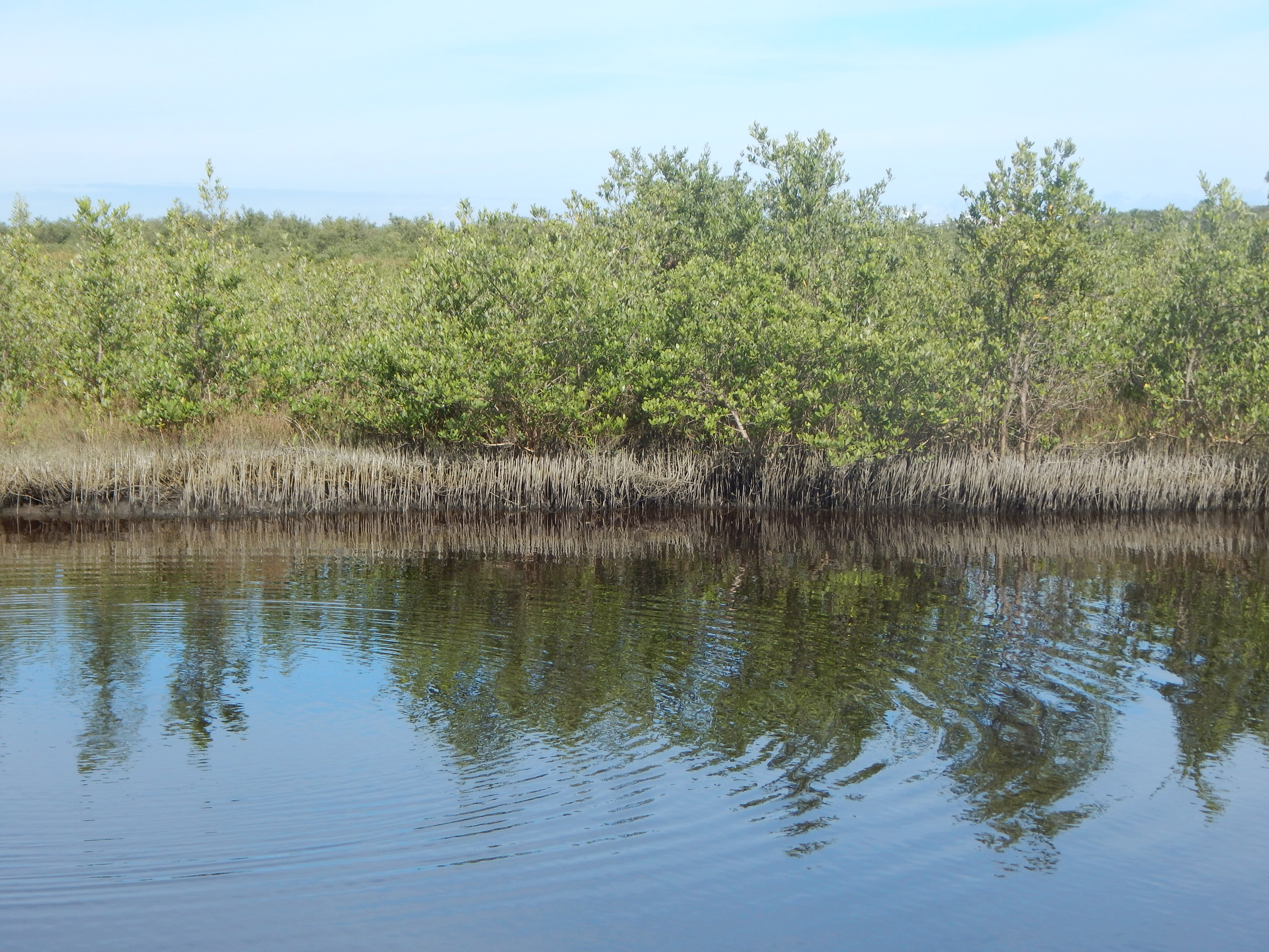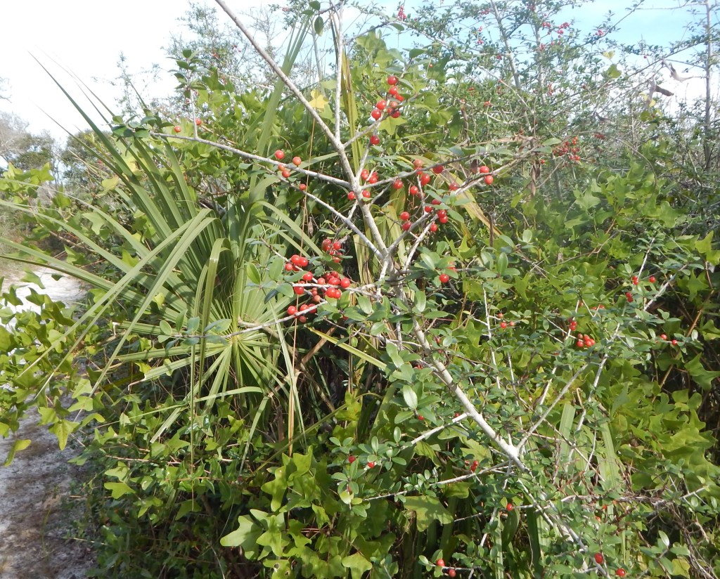 I wish I could convey the smells and sounds of this hike. It is one of my favorites in the area. There is the damp earthy odor of the mangrove, the spicy fragrance of Gerberia and Red Bay, the squeaks of an irritated squirrel, and whispering sighs of the sea breeze through the stiff underbrush and oak branches. Then, there are the tiny red berries of Yaupon Holly, decked out for Christmas.