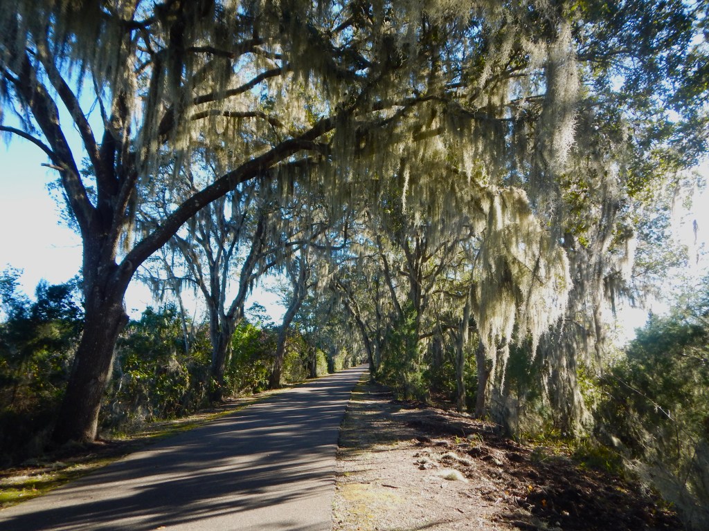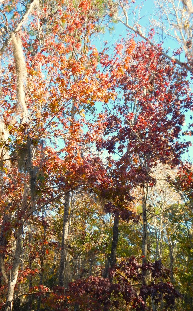 The oak trees were looking dazzling in their holiday finery… oh, yes… they do wear it all year round. I’m not sure just why the Spanish moss seems to prefer oak trees but there it is. The oaks are evergreen live oaks, retaining their green leaves year round, although new leaves will push older ones off in the spring. The red maples and Liquidambar were, for the most part, naked in the late autumn sunlight.