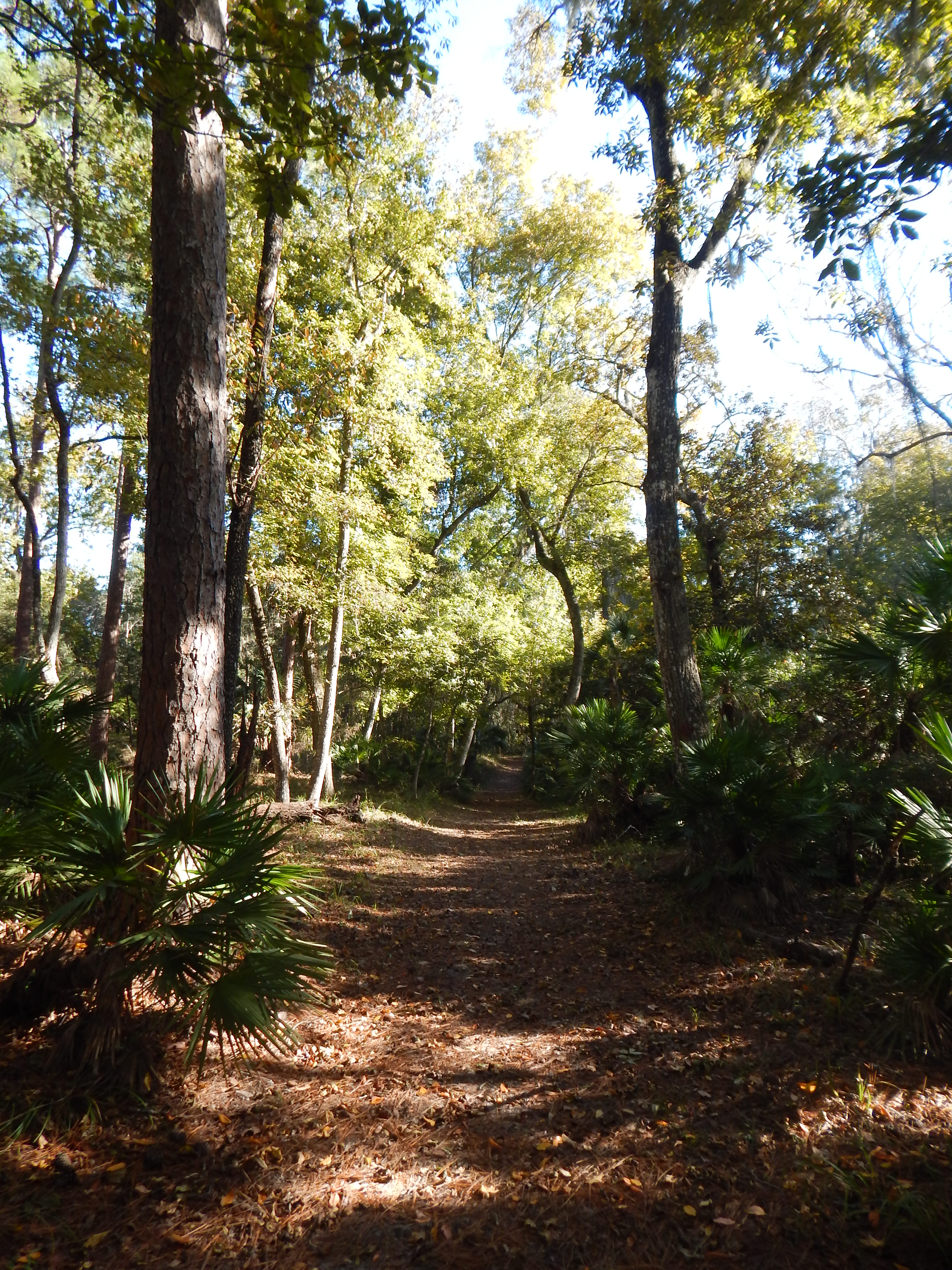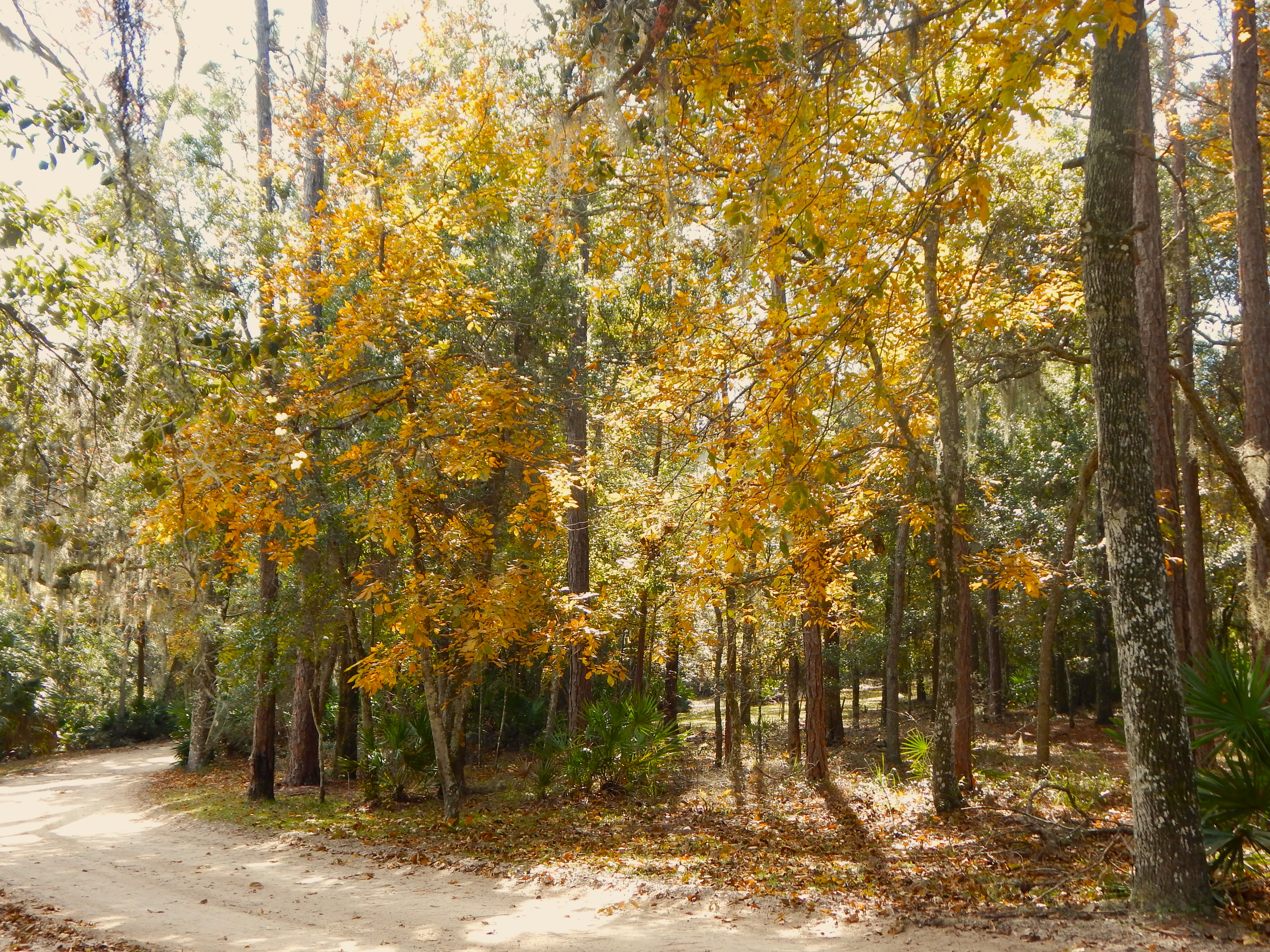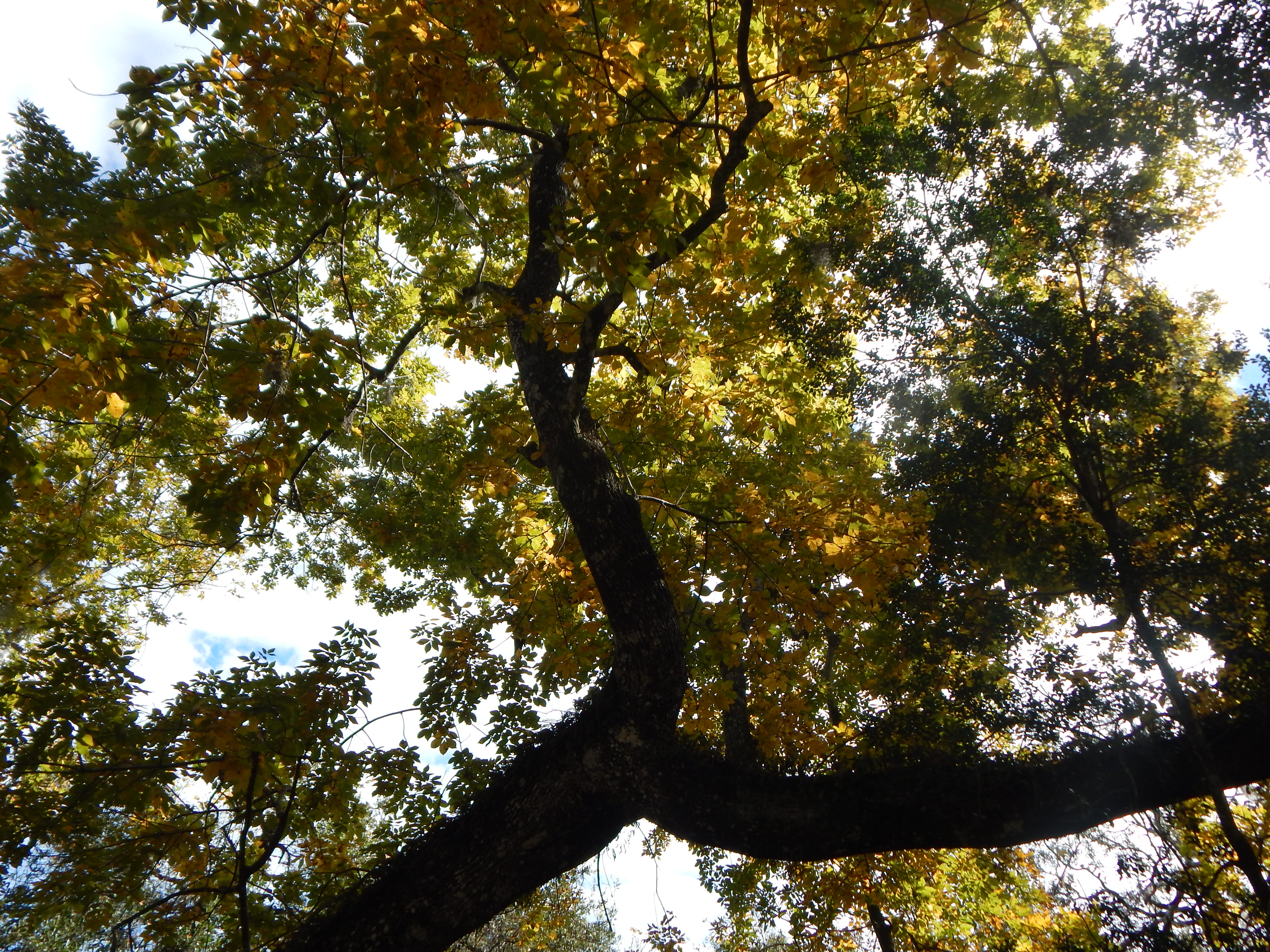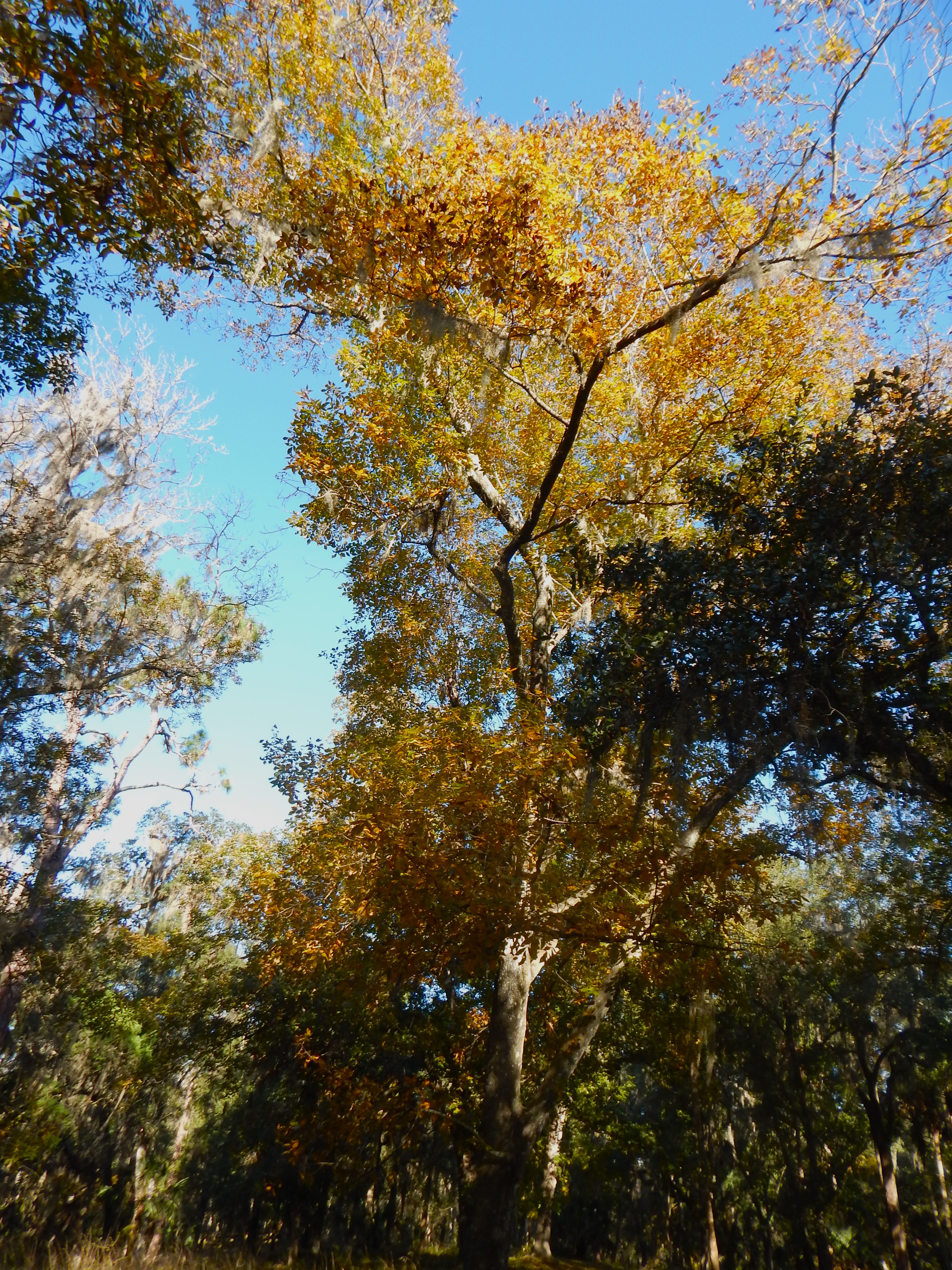 For some reason, the first portion of the Hominy Branch Trail awakens deep memories within. The combination of towering live oaks and hickories brings back memories of times spent in woods as a druid a very long time ago… over 2,000 years ago if I recollect correctly. Anyway, being amidst large towering trees brings me quiet joy. Seeing the hickories in their late autumn glory just added to the moment.