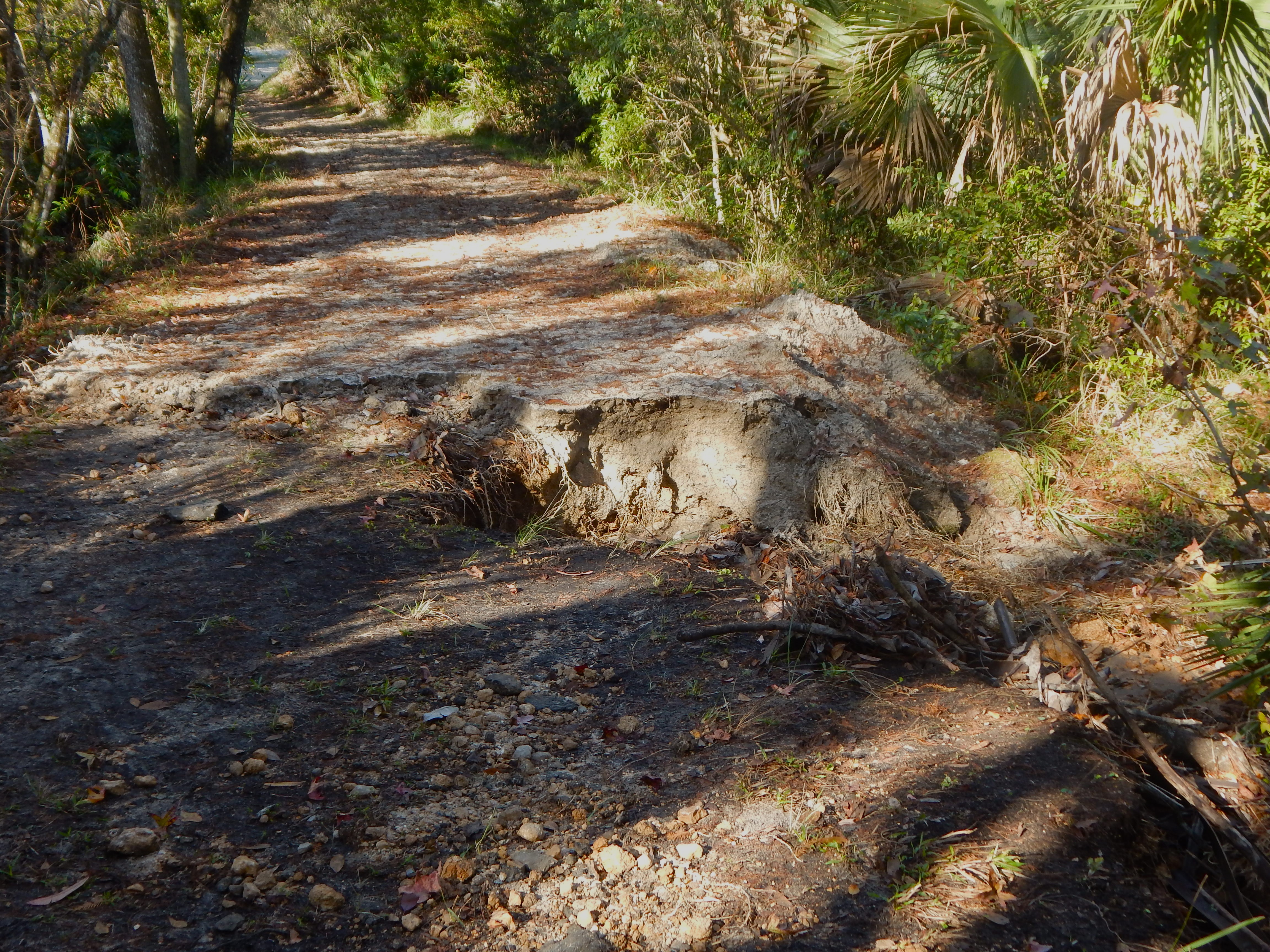 The equestrian trail had some damage on a creek crossing, indicating the impact of the excessive rain of this past year. These trails are wide enough for a truck, but this particular one will require some rebuilding before it is safe to drive a heavy vehicle over the culvert. I didn’t have any problem. A red bay tree was also down over the trail a few feet away. Besides some deeper puddles elsewhere, some short branches on the trails, there was little other indication of the storm we had recently.