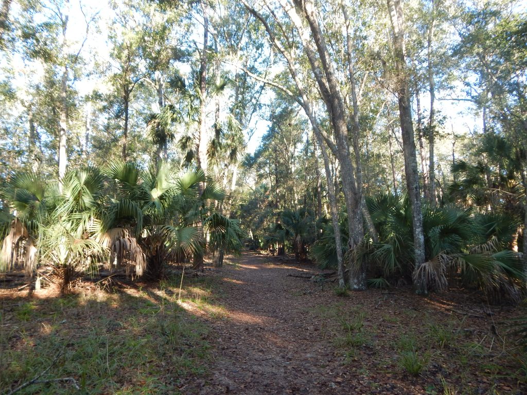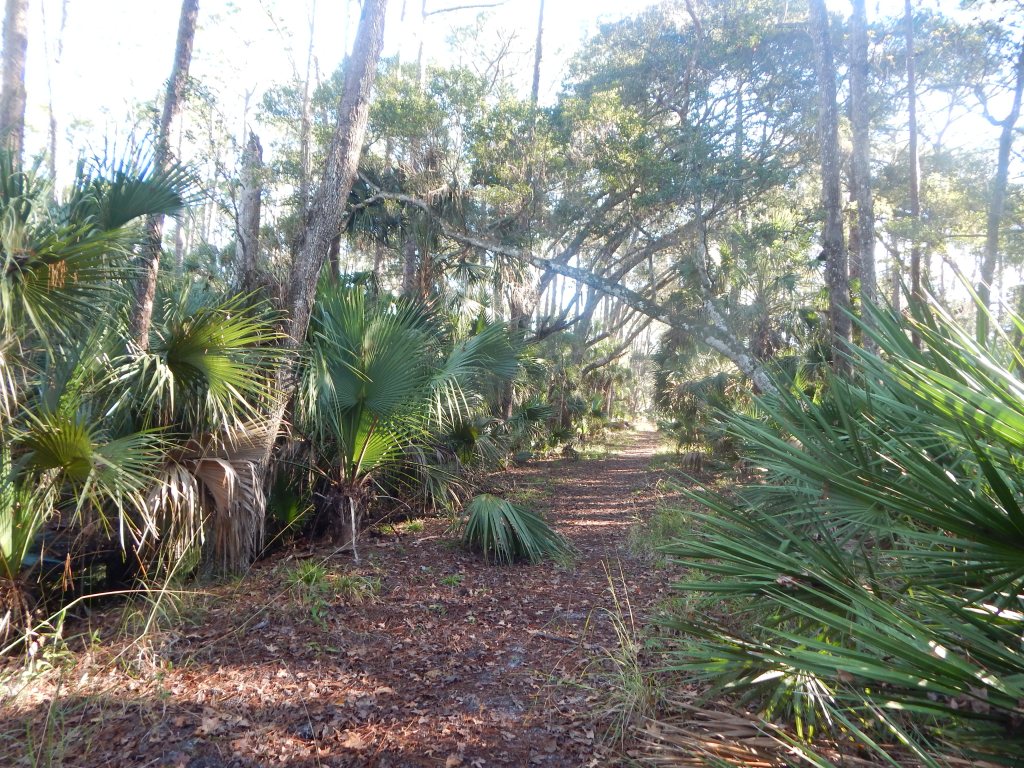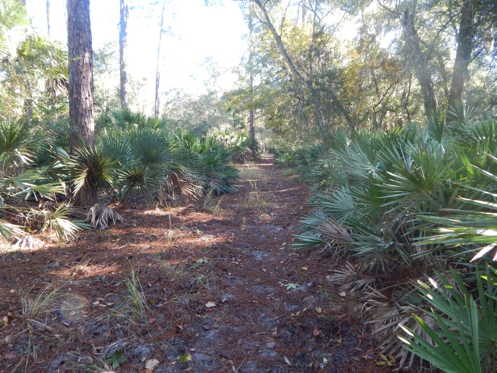 When I first walked on this trail, starting from Fairchild Oak State Park, it was basically an old road, wide and sandy. During the intervening years and several hurricanes later, the road is slowly being encroached by Saw palmetto and wild grasses, taking on the appearance of a real trail. It is no longer possible for a vehicle to travel along this path unless some of the Saw palmetto is trimmed back.