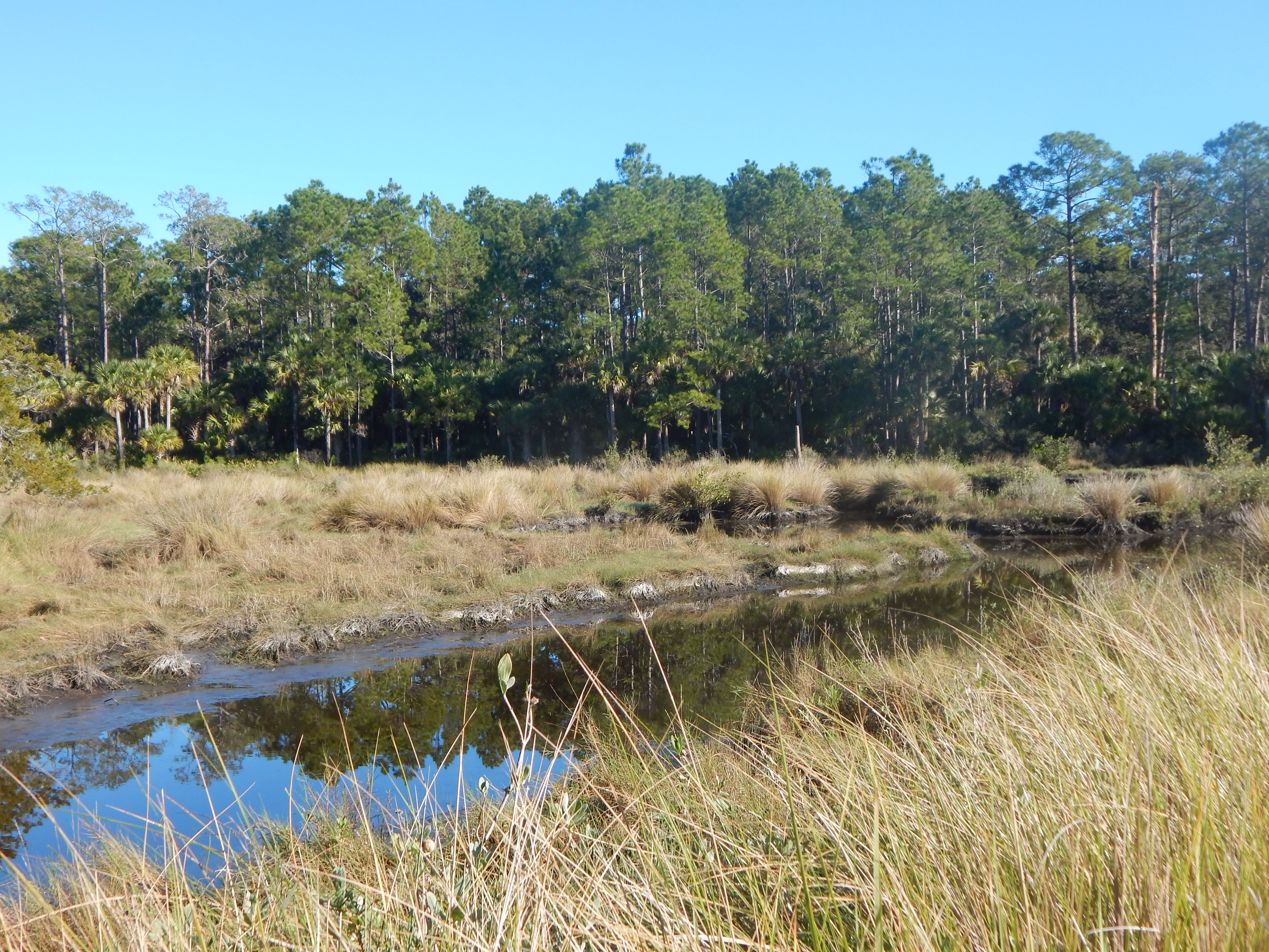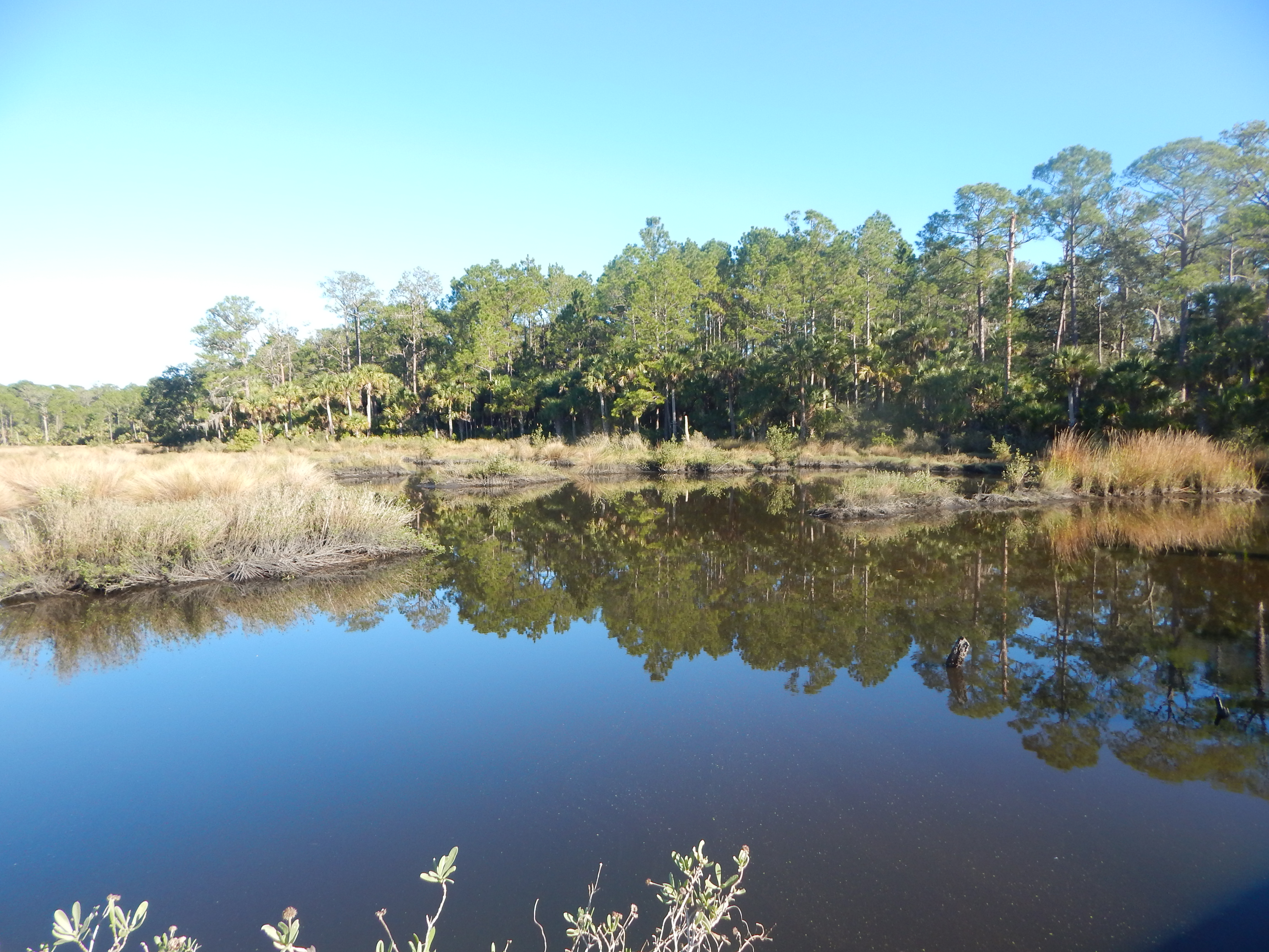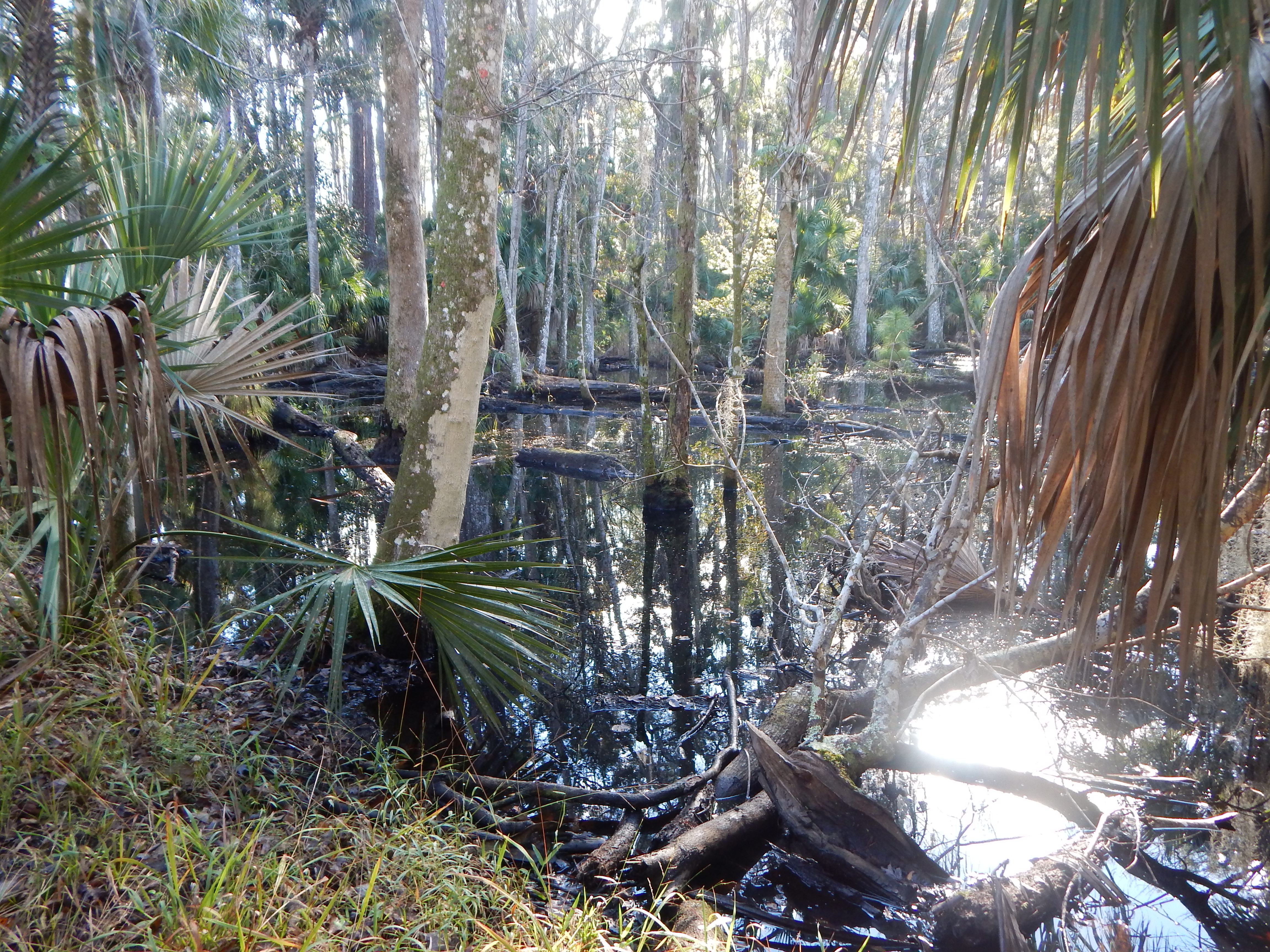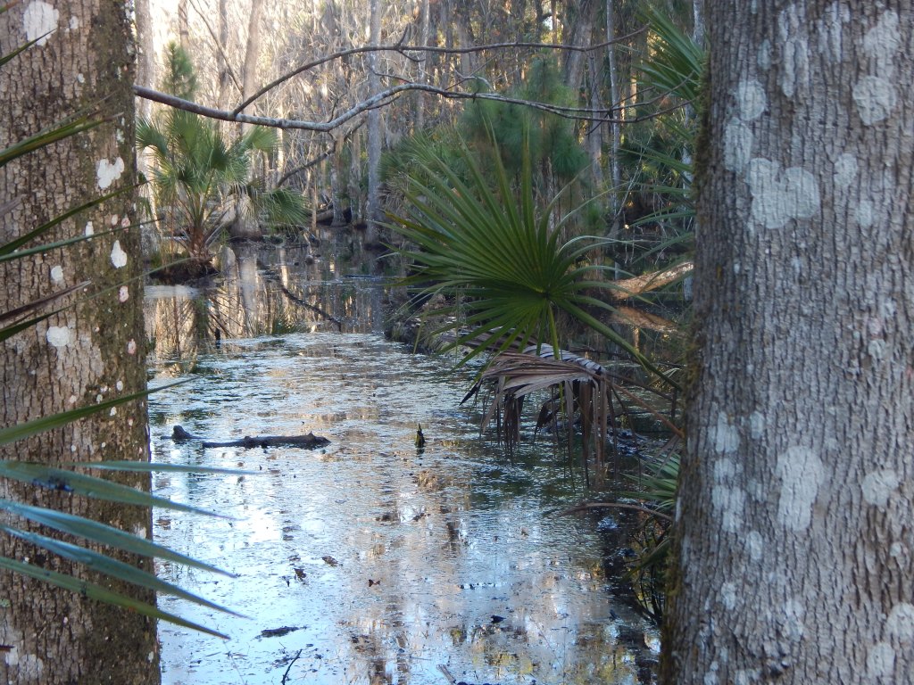 As you draw closer to Cedar Creek, the trail follows the old road bed, perched above the water level of two marshes and muddy creeks that follow the old drainage ditches. In a couple of areas, springs or overflow from the marshes crosses the old road, creating some serious mud patches that require careful negotiation unless you want to lose a shoe to some orange-tinted mud. I had to do some green belays off of Saw Palmetto and wound around a few trees off the trail to avoid the worst spots.