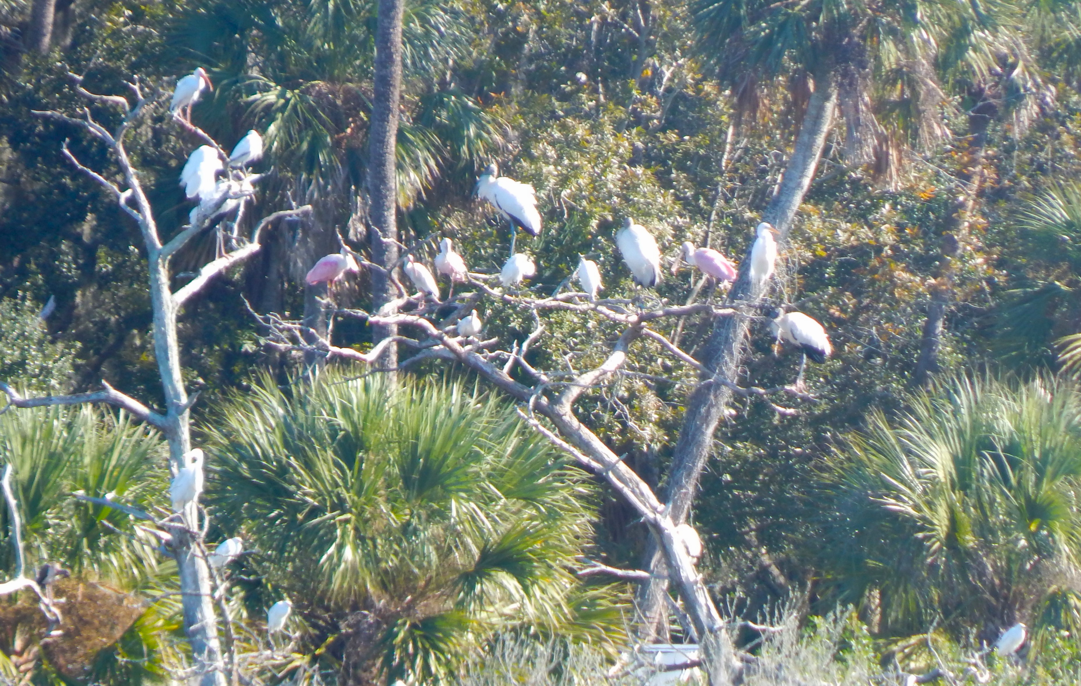 While I was parked under the shade of a Red Cedar, I noticed several white and black birds flying above the salt marsh. I snapped a photo of a tree across the way where several birds were perched. Looking over the photo, I discerned at least three species: Wood Storks, Ibis and Roseate Spoonbill. I also noted some smaller egrets, possible Cattle Egrets, although it was hard to tell from a distance. There was also a White Egret fishing nearby — I could hear its harsh call periodically. A tri-colored heron was also fishing across one of the channels. And I hear the call of an osprey and saw a very large bird take off, perhaps disturbed by my presence — it could have been a Great Blue Heron as the wingspan was enormous.
