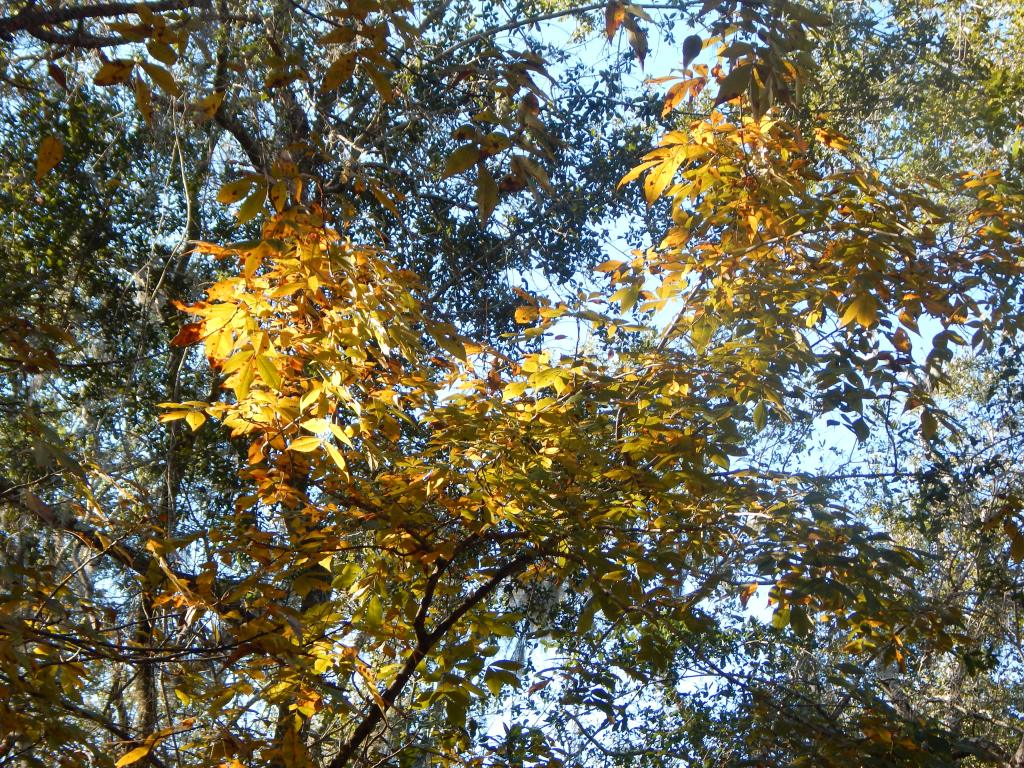 Although autumn recently edged into winter, there still was some remaining golden flickers of the last Pignut Hickories, still shedding their leaves. The path was a thick carpet of leaves and fallen pine needles in places overlying the white sandy surface.