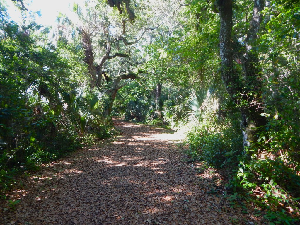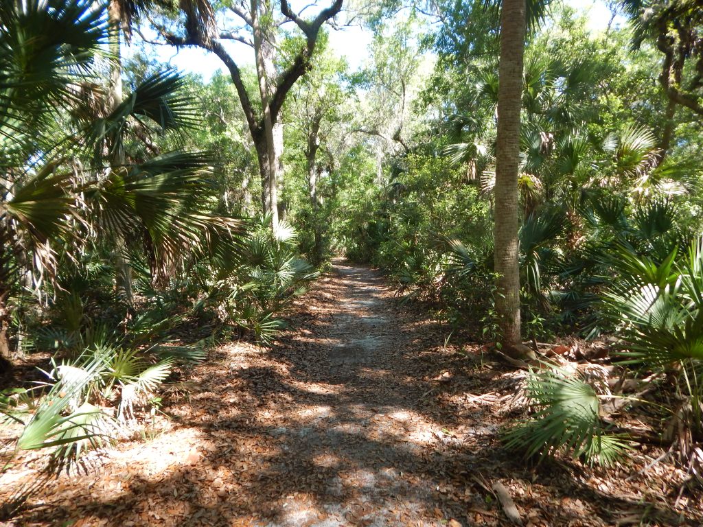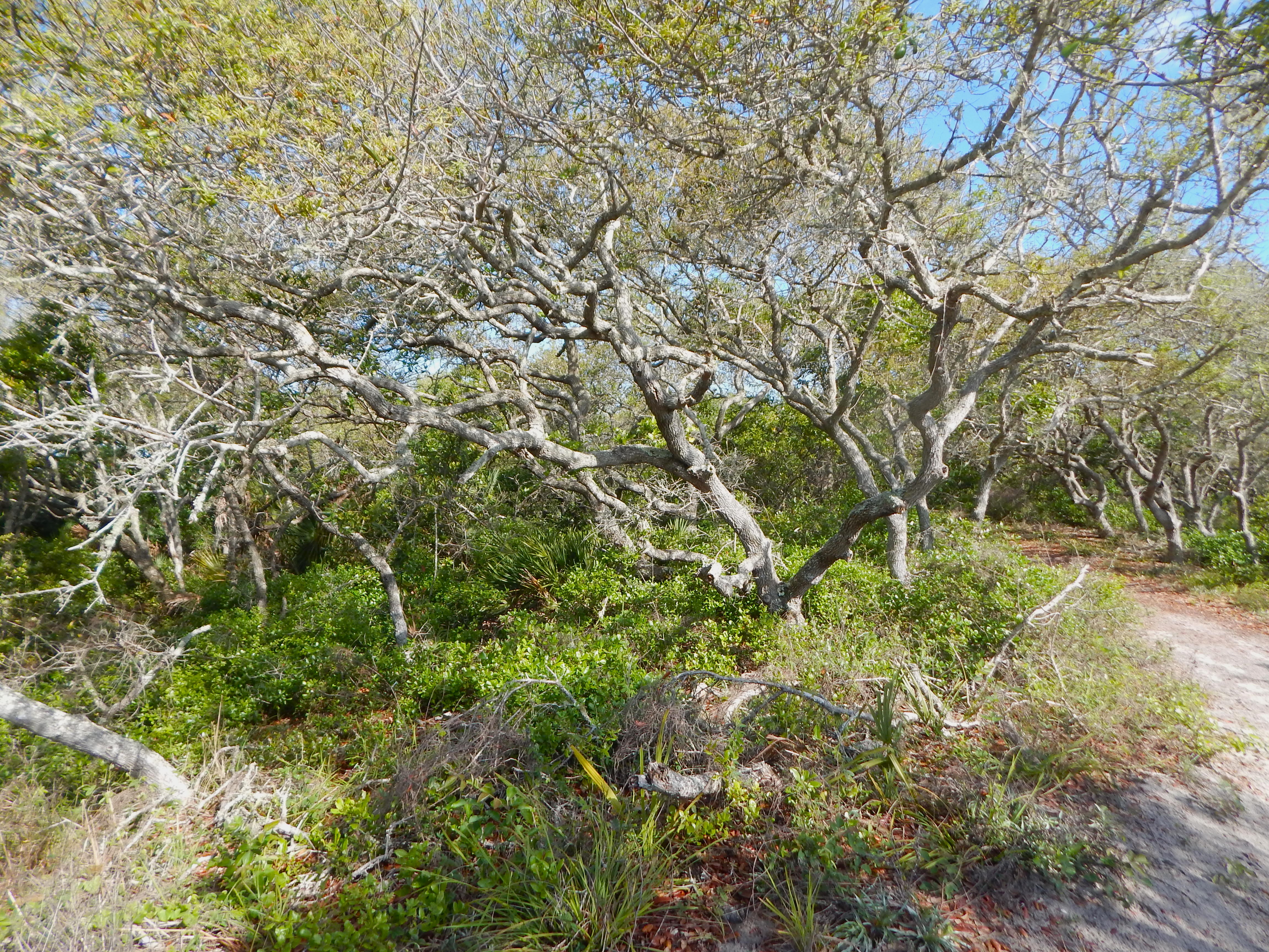 Here I am at the Nature Trail at Washington Oaks Gardens SP. It is about 2.5 miles long and first enters deep shady hammock, then briefly ventures out into coastal scrub, the remnant of which survived inundation by Hurricane Matthew’s storm surge which crossed nearby SR A1A, killing the sand oaks on the edge of the hammock. Only silvery stumps remain starkly telling their tale as they loom above the saw palmetto and other shrubs.