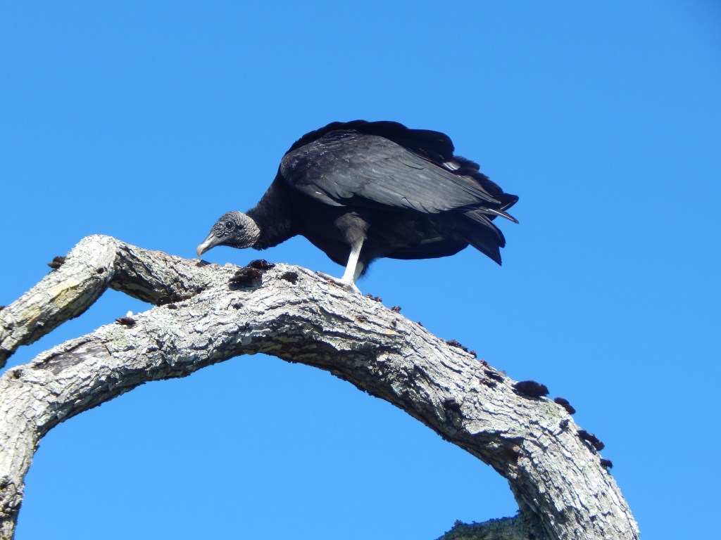 I encountered this fellow when I was just starting the River to Sea Preserve walk. I was a little out of the way of my normal path, avoiding as I was a noisy gathering at the picnic shelter. The black buzzard noticed me, turned around as I carefully approached trying not to frighten it. It peered down at me with a beady eye, curiously, flapped its wings but didn’t fly off. Peaceful human. It was still there on its perch when I turned a corner out of sight. The buzzards are often seen on sunny days soaring along with the unseen thermal currents. As homely as they are close-up, they are majestic fliers.
