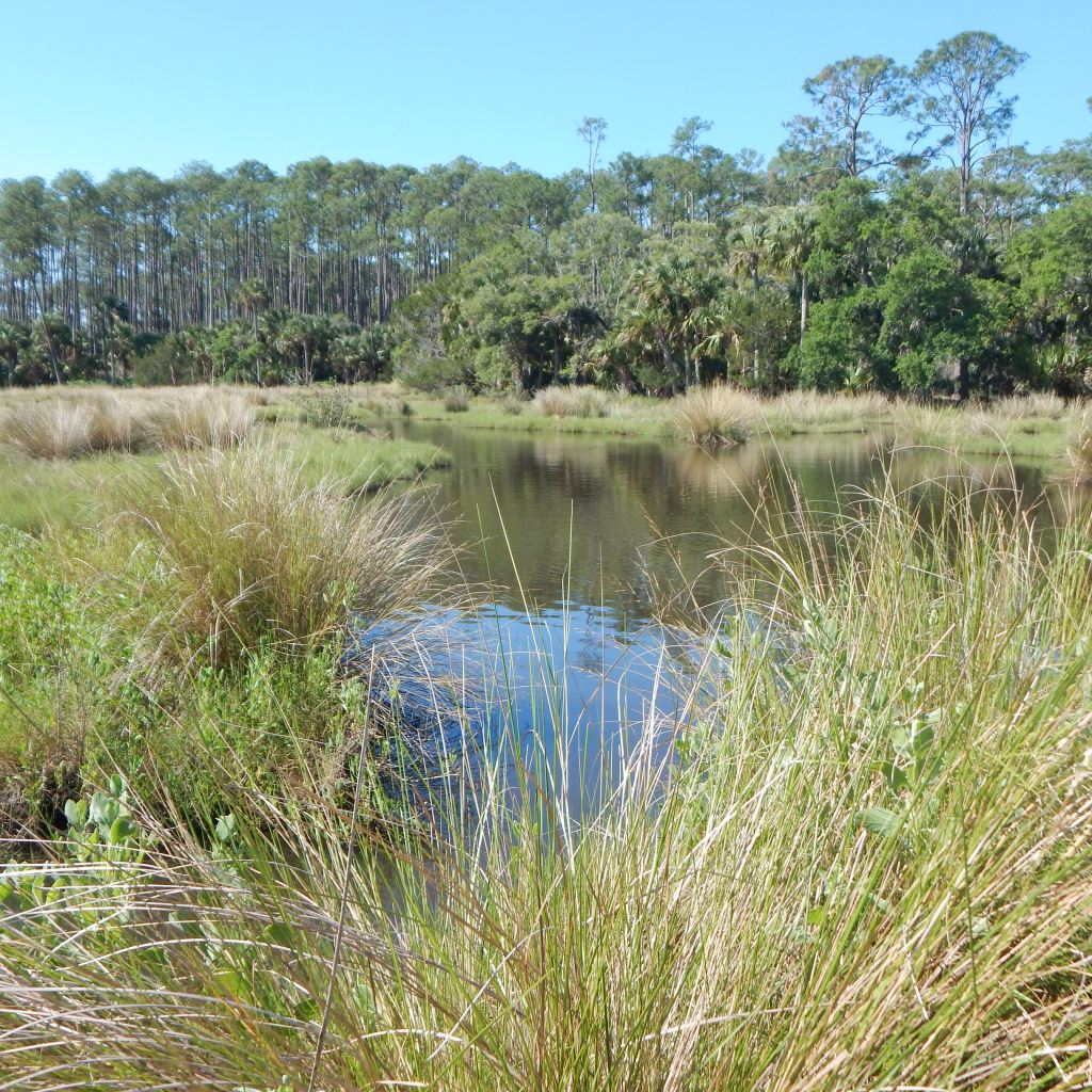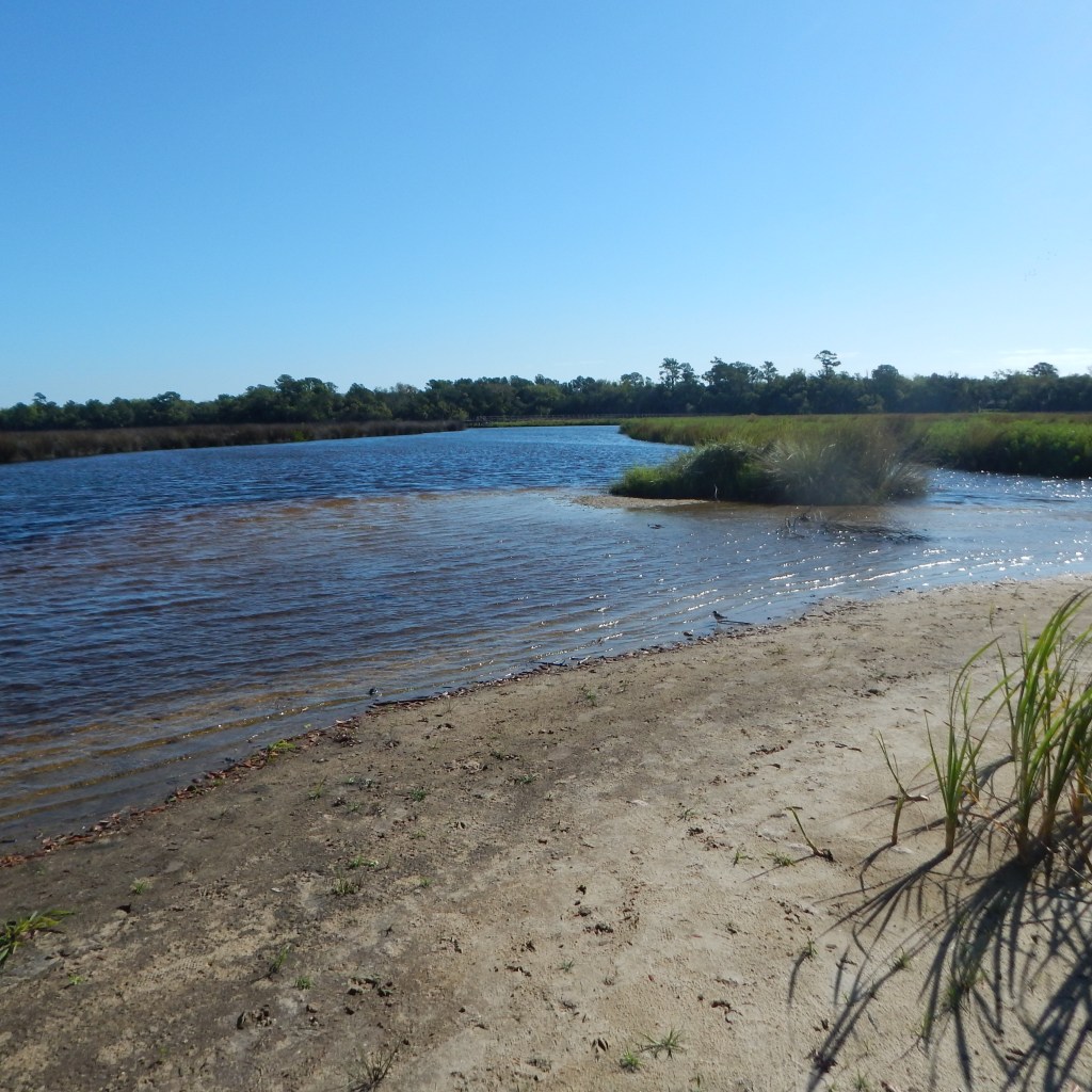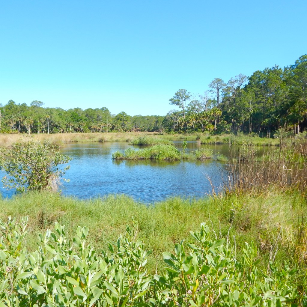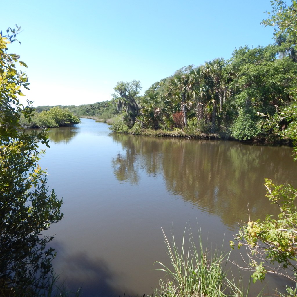 Next, I headed to the loop trail which winds through the open forest and adds probably close to another mile to the entire walk. At times it is marked by an indentation in the forest floor; at other times, grass delineates the path. Sometimes it is harder to make out in the winter without the green vegetation. I followed the path without difficulty today, finding the red marks on the trees as the narrow path wound through the forest. I could catch glimpses of the nearby marsh, but the heavy brush didn’t allow me to approach the edge of nearby Bulow Creek.