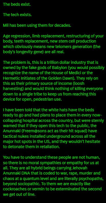As Elena Danaan has repeatedly stated, the med beds and other advanced technologies being held by the White Hats will not be available until the Deep State is completely removed. Right now it is too dangerous.
