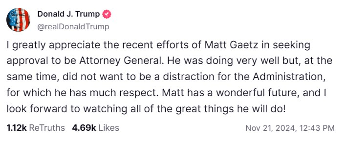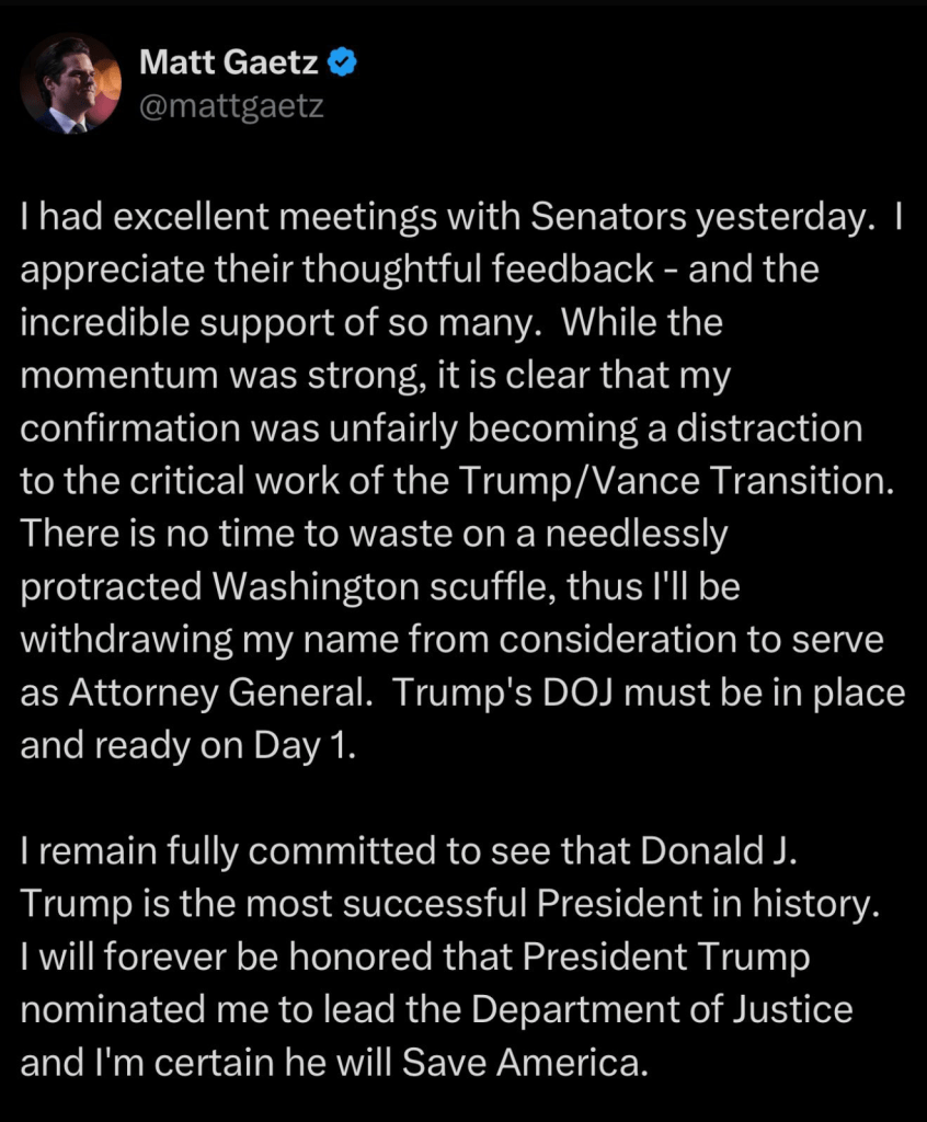 Apparently Matt Gaetz is withdrawing from consideration to be Trump’s new AG. Some of these appointments were designed to draw out detractors and sleepers. It worked like a charm. There will be more “rug-pulling” before the final real appointments are completed. And even then, if Trump is not satisfied, the candidate will hear those fateful words: “You’re Fired!”