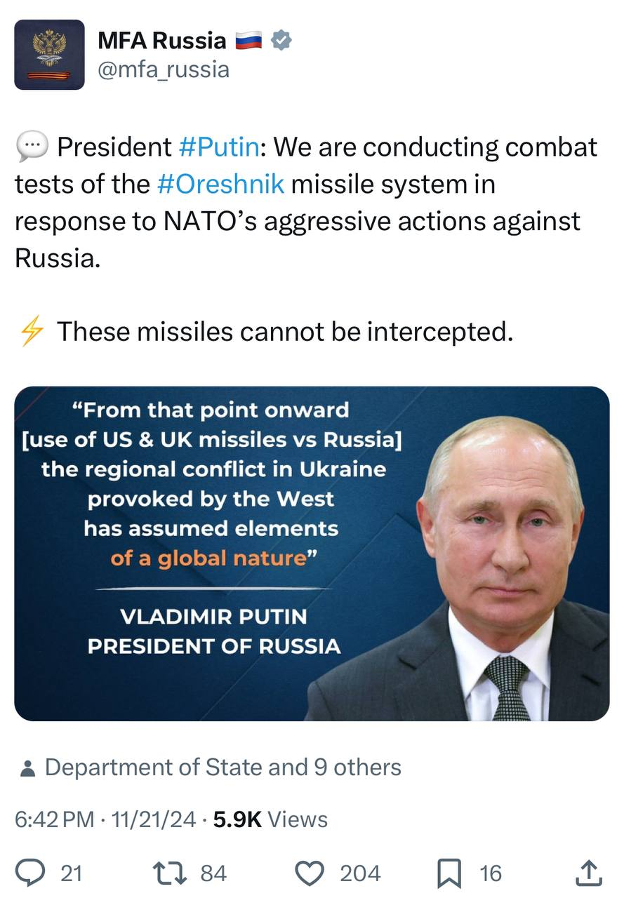 He confirms that Russian MIL are conducting “combat tests” of the Oreshnik missile system, a Mach 10 hypersonic Intermediate Range Ballistic Missile (IRBM), in response to NATO’s escalation.