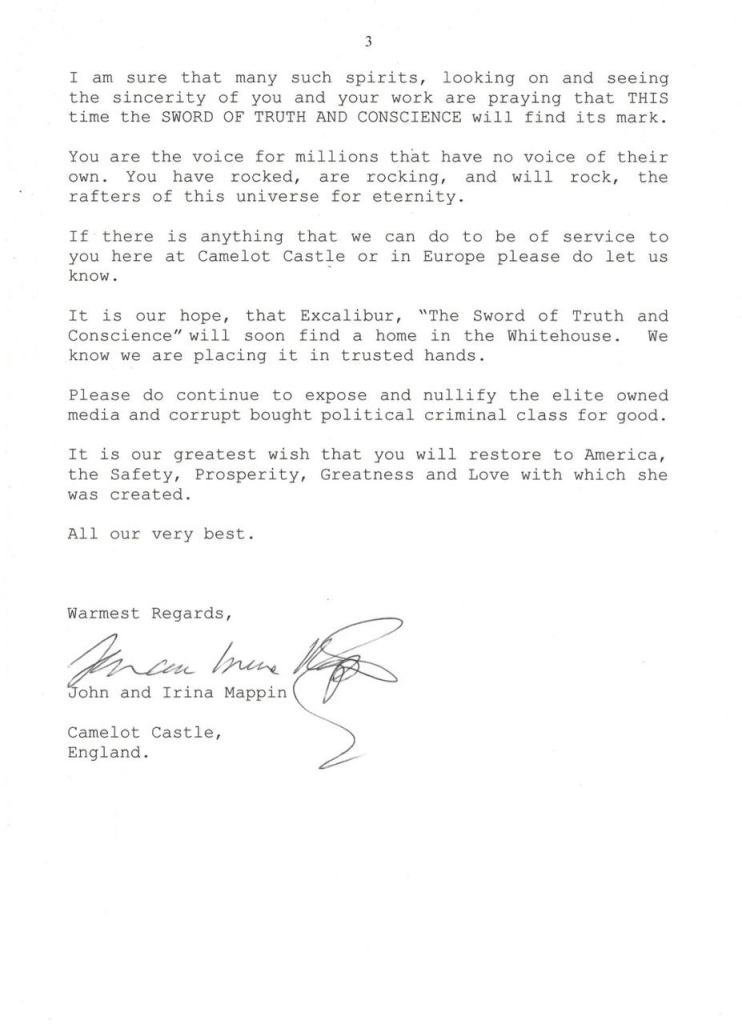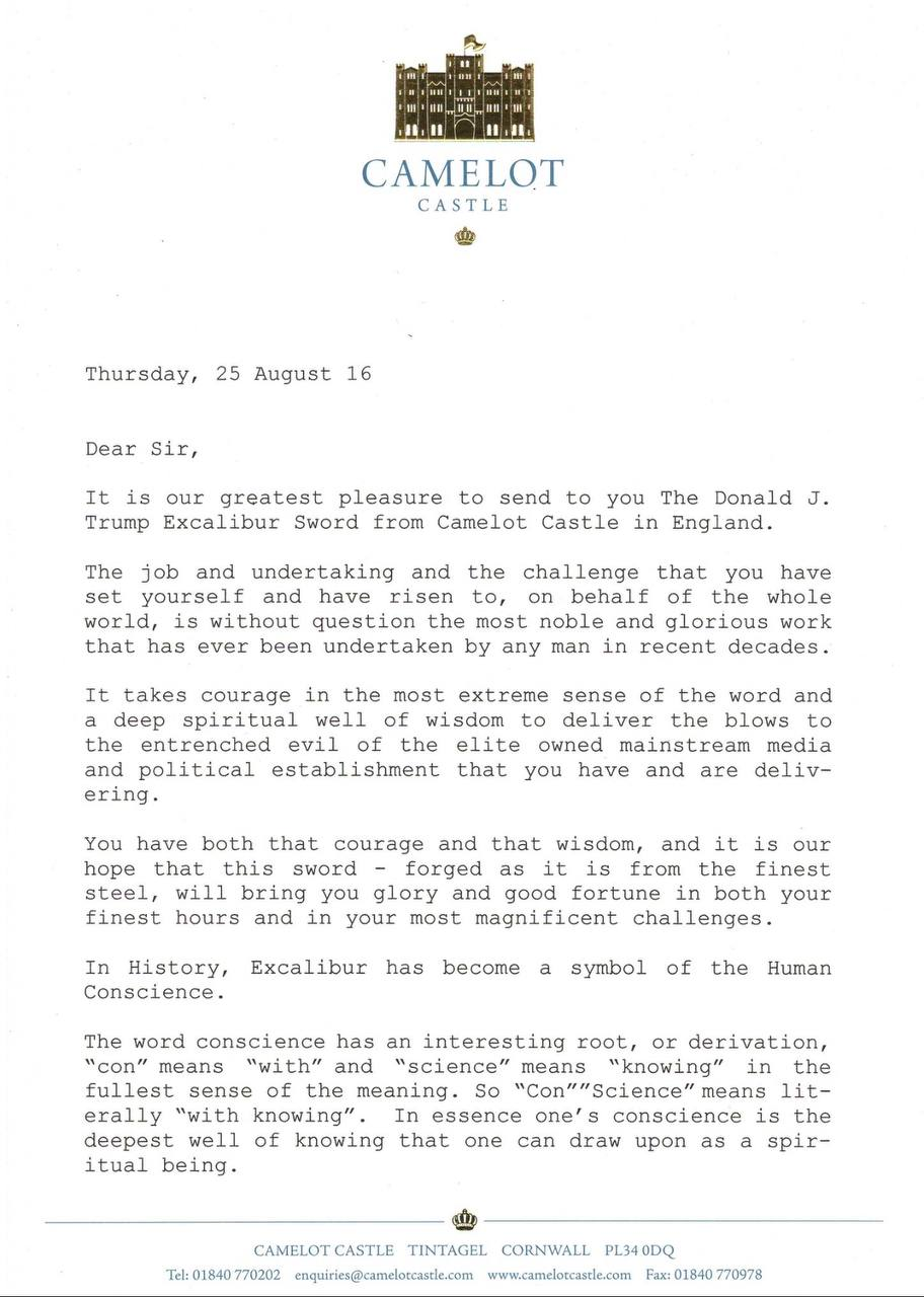 King Arthur’s sword “Excalibur” was delivered to Trump tower on 9/2/2016! The sword was accompanied by this letter (3 pages, following):