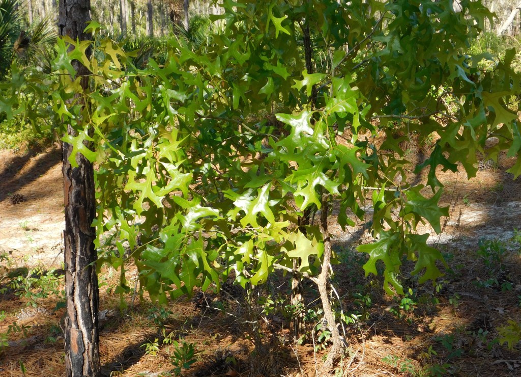 Chapman Oak can be found in piney woods and coastal strand. It usually doesn’t get too tall, especially in coastal strand microclimates, that demanding salty poor thin soil area. It grows amongst the Live sand oak, distinguished by its scoop-shaped leaves. It is deciduous as can be seen by the fresh leaves in the photo above.