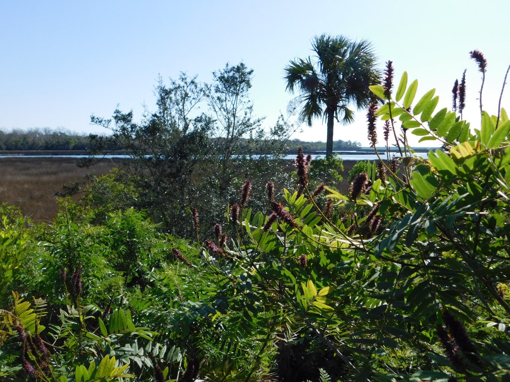 The bush with the flower spikes is False Indigo. It can be found on the edge of salt marshes and in the coastal strand like at North Peninsula State Park and Washington Oaks Gardens.