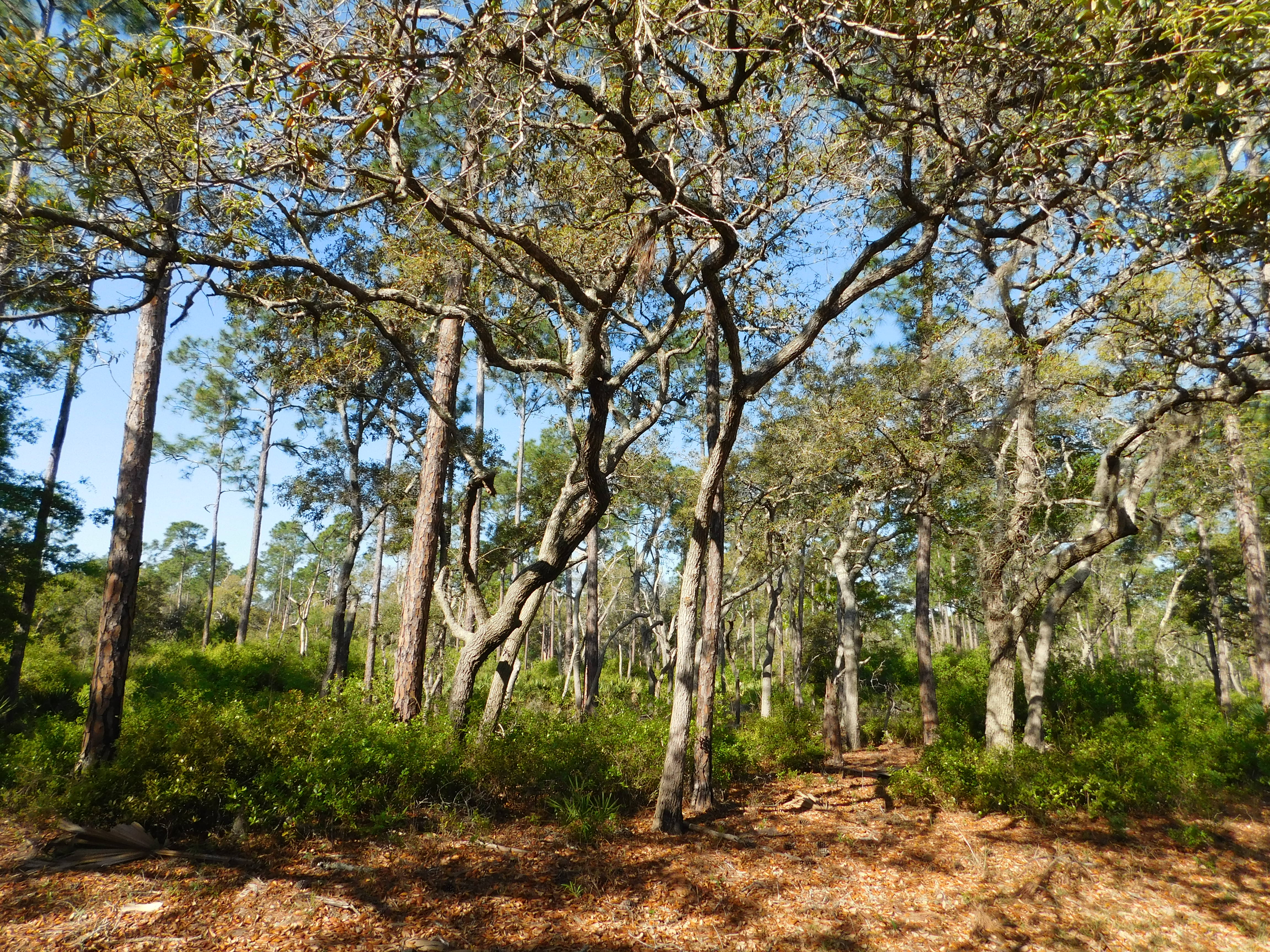 Chapman Oak can be found in piney woods and coastal strand. It usually doesn’t get too tall, especially in coastal strand microclimates, that demanding salty poor thin soil area. It grows amongst the Live sand oak, distinguished by its scoop-shaped leaves. It is deciduous as can be seen by the fresh leaves in the photo above.