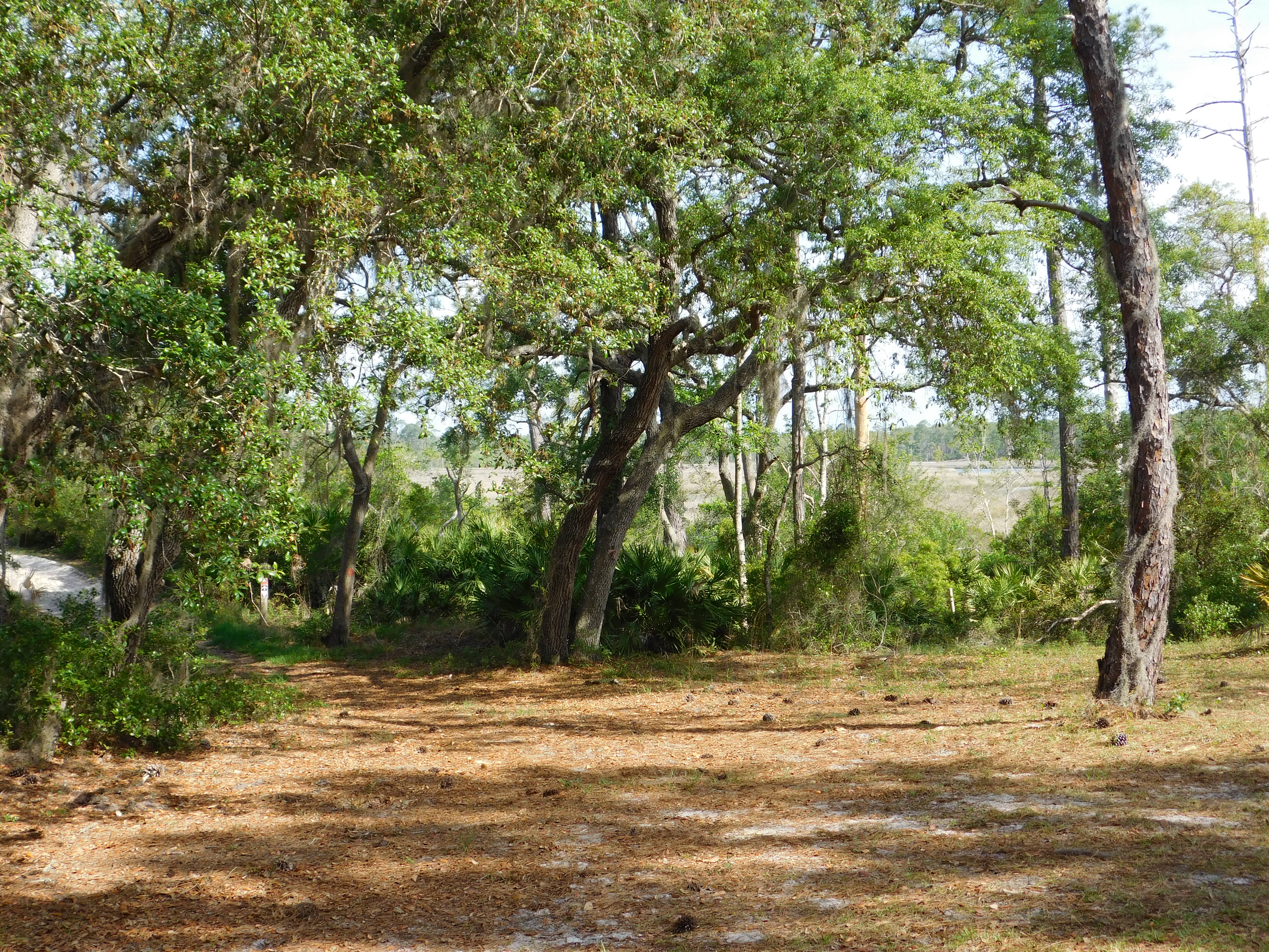 Inspired by my escapade on Monday, I returned on Thursday to Princess Place to scout another route connecting the Equestrian Trail and the Long Leaf Trail that wasn’t quite as long. This time I started at the old Hominy Branch Trailhead. A portion of the Equestrian Trail goes through here, but as I’ve noted in the past, the Hominy Branch Trail is no longer a viable loop. A portion of it was closed off before I returned to this area. So, I was looking for other interesting options. This time I backtracked along the Equestrian Trail. The trail splits into a short .6 mile (1 Km) loop and reconnects near the main Princess Place access road. At least that’s what it is supposed to do. Somehow I missed the connection and ended up, still on the loop (it was marked) which bordered the Two Son Ranch. This sandy lumpy trail took me to the road where I found the intersection with the rest of the trail. Part of the current trail is not marked on the map. I choose to go around the marsh which shows as a bump-out on the map.