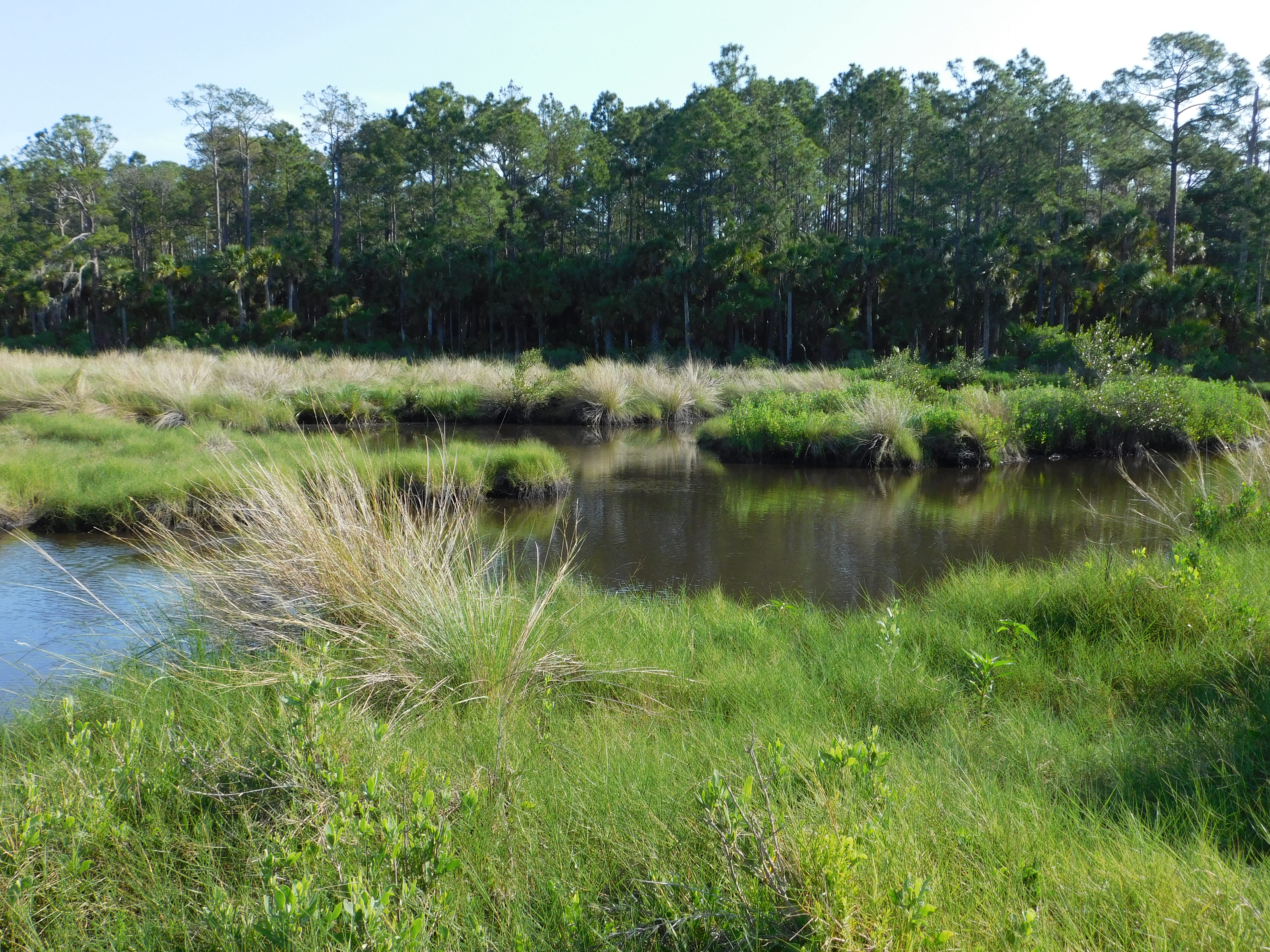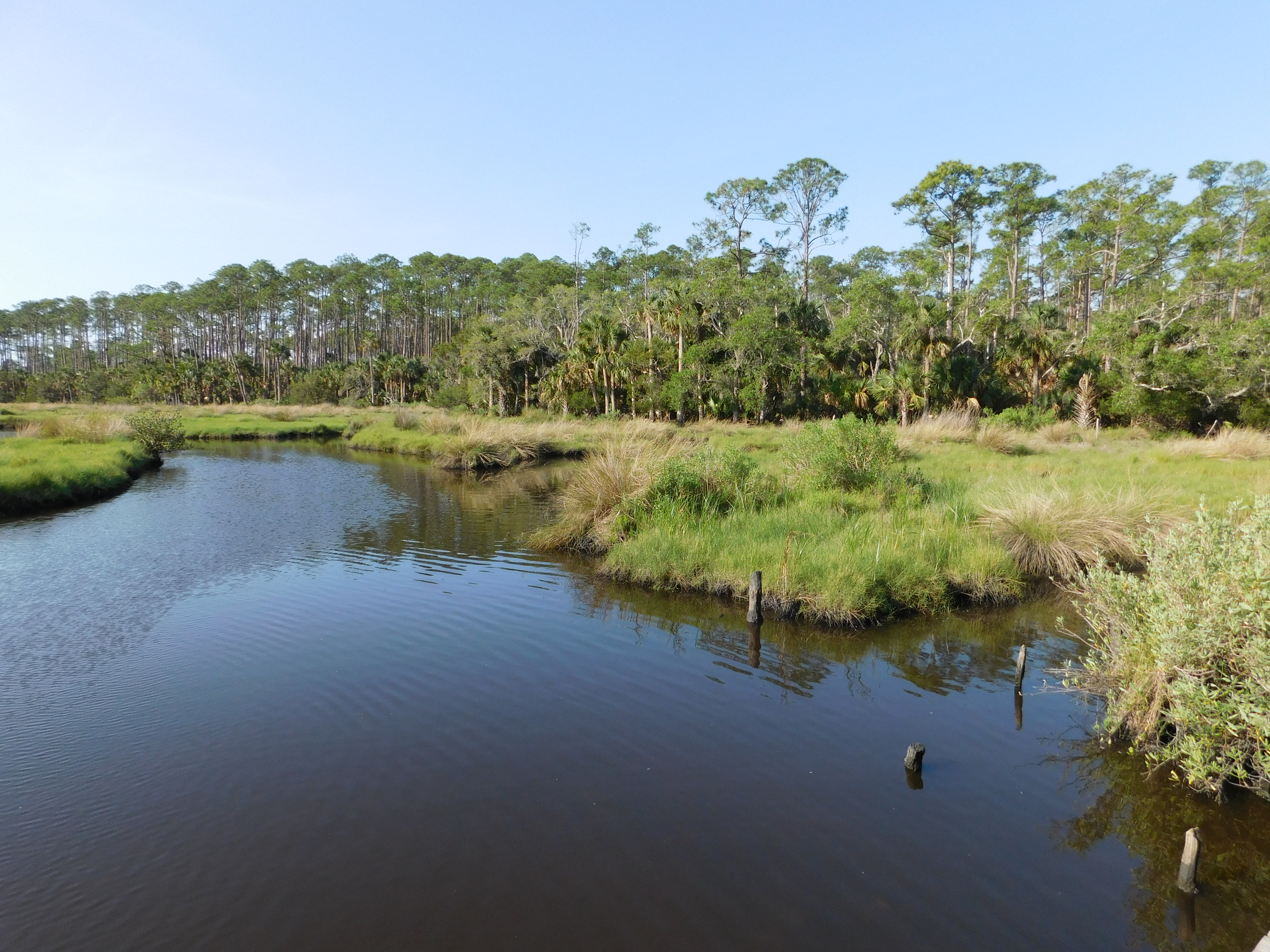 From the observation platform on Long Leaf Trail (which is also part of the Equestrian Trail) you can view Pellicer Creek. It is a protected waterway and separates Flagler County from St. Johns County. Pellicer Creek flows into the Intracoastal Waterway west of Marine World and River to Sea Preserve.