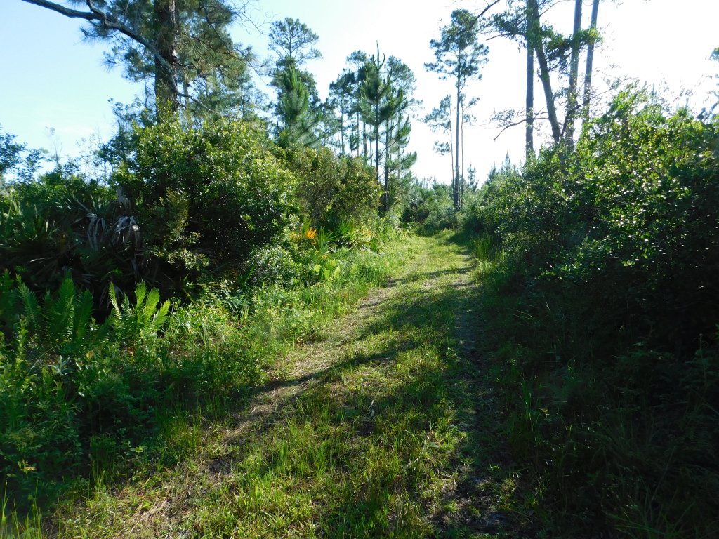 A week ago (May 27th) I took a hike at Princess Place, from the trailhead parking for Hominy Branch, but headed out on the Equestrian Trail or at least portions of it. I ended up on a couple of lesser used section roads but found my way back to the main equestrian trail along Pellicer Creek. I think part of the way I was actually walking through the Pellicer Creek Preserve that butts up against Princess Place. It would be hard to get lost in these woods, but I suppose some people might. I didn’t see another soul during 2.5 hours of tramping through the open woods and clearings on alternately sandy and grassy trail surfaces. Since it was the day after Memorial Day, the park was practically empty. I also tend to arrive early to avoid the onset of the heat. However, by the time I got back to the car, my clothes were drenched due to the high humidity. It felt good to get the car’s A/C going. I’m grateful for modern gadgets… sometimes.