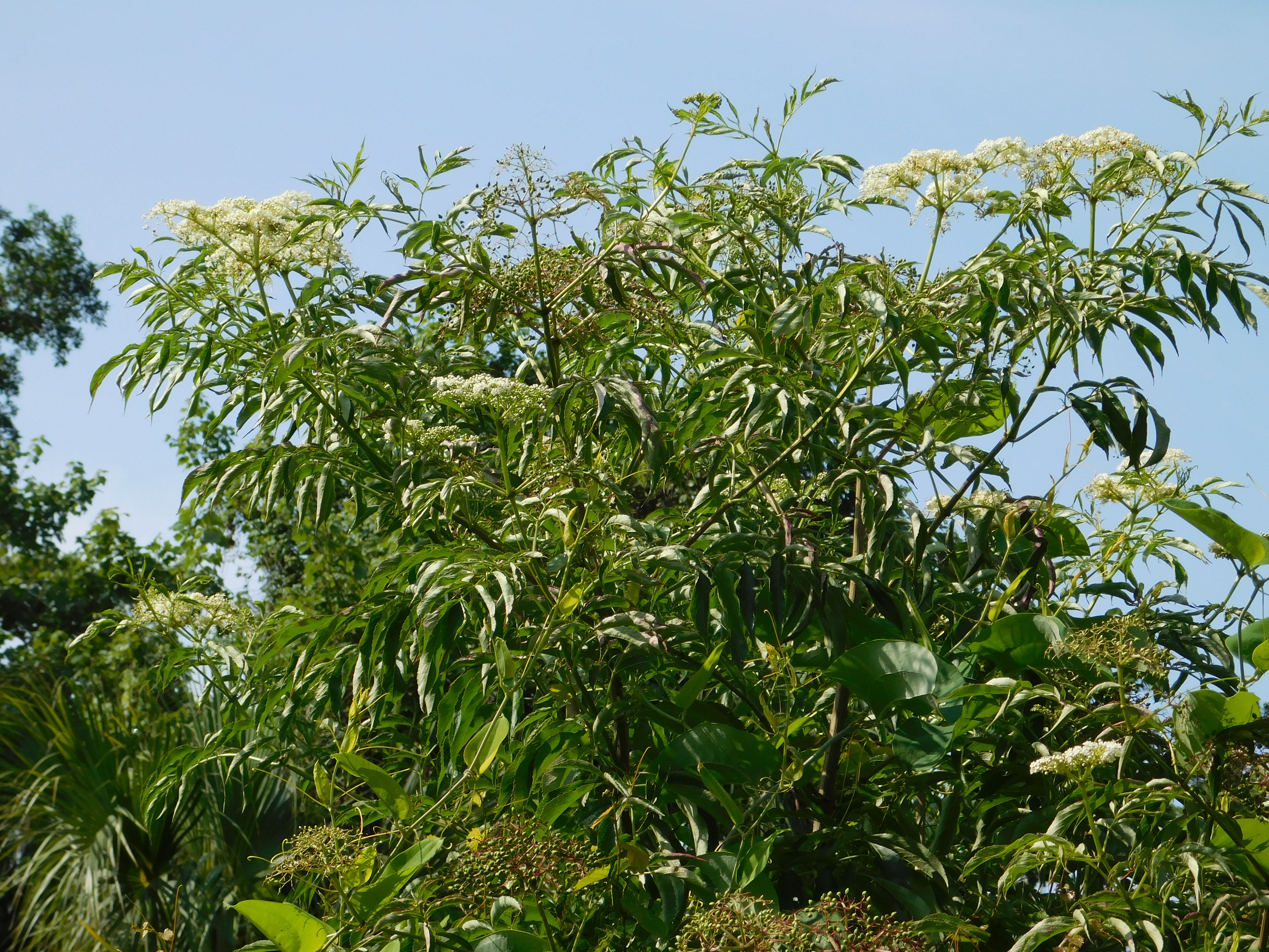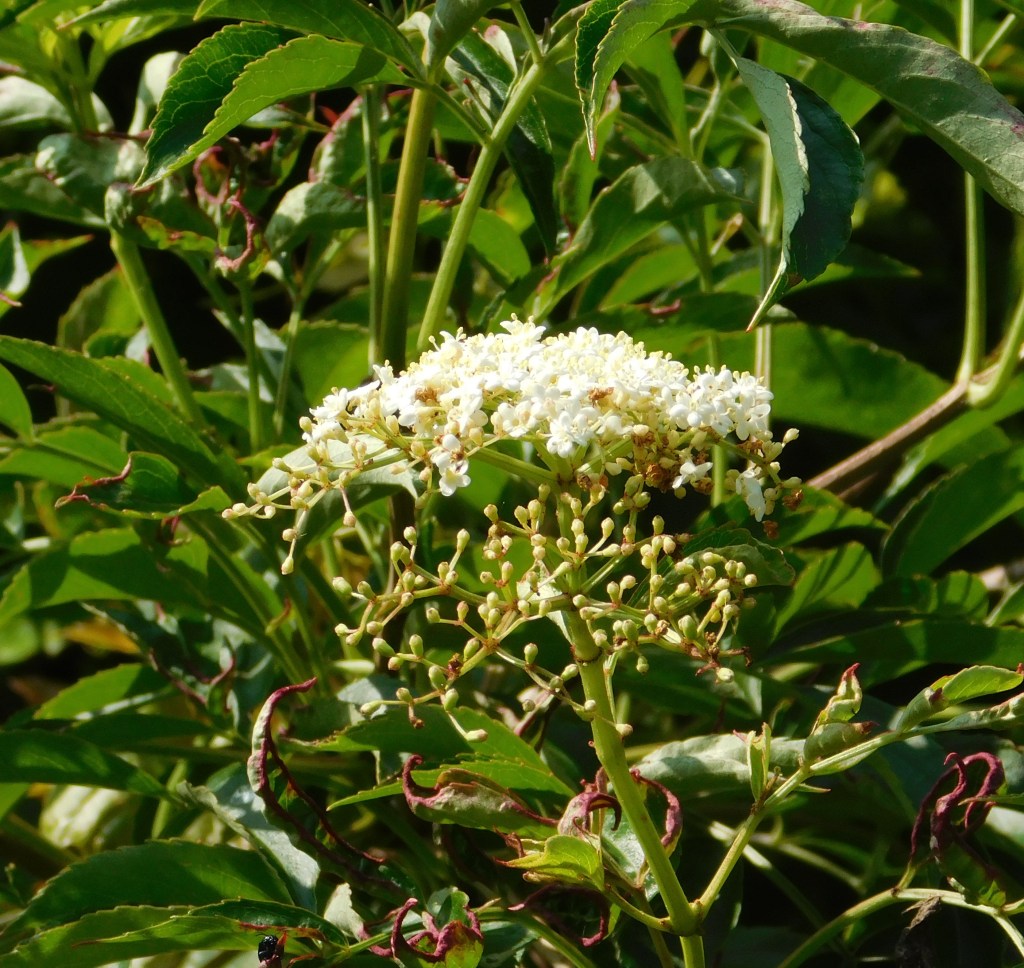 In case you were wondering, Elderberry is native to parts of Florida. It even grows in a vacant lot near where I live. The vigorous plant prefers a sunny spot and feeds a lot of birds when the berries are ripe. Its Latin name is Sambucus nigra subsp. canadensis.