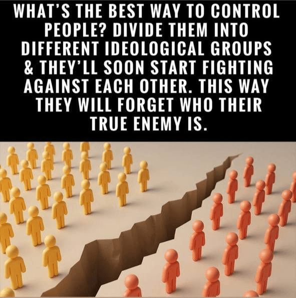 If you can separate people into rigid camps: left vs. right, race vs. race, religion vs. religion, man vs. woman, then they’ll spend all their energy tearing each other apart. They’ll argue endlessly over labels, identities, and ideologies while the true architects of their misery sit comfortably in the shadows, untouched and unchallenged.