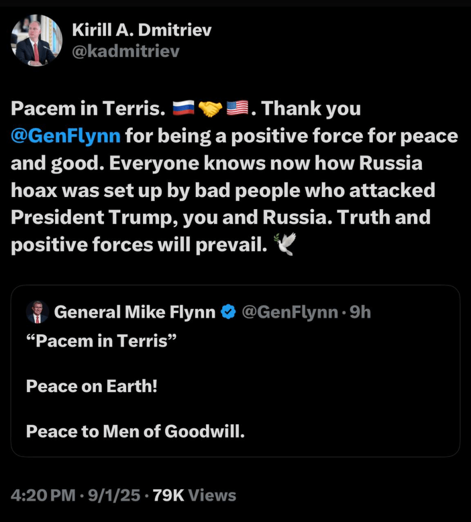 Dmitriev then retweeted the whole thread replying with: “Pacem in Terris” 🇷🇺🤝🇺🇸. Thank you @GenFlynn for being a positive force for peace and good. Everyone knows now how Russia hoax was set up by bad people who attacked President Trump, you and Russia. Truth and positive forces will prevail. 🕊️