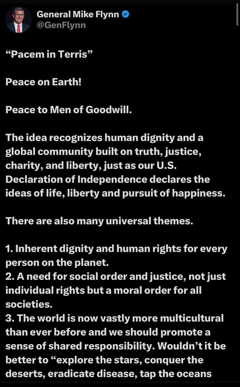 General Flynn then retweeted Dmitriev’s Q+ acknowledgement, adding “Pacem in Terris”