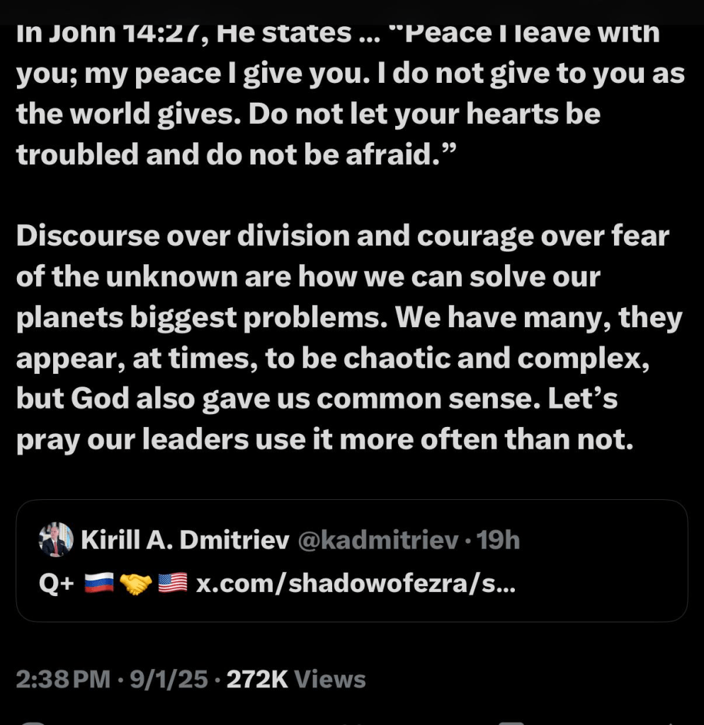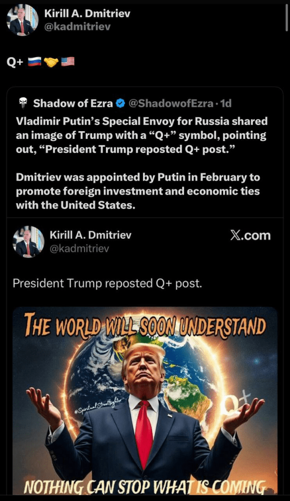Kirill Dmitriev, Putin’s Special Envoy of The President of Russia for Investment and Economic Cooperation retweeted President Trump’s 8/31 “Q+” meme.