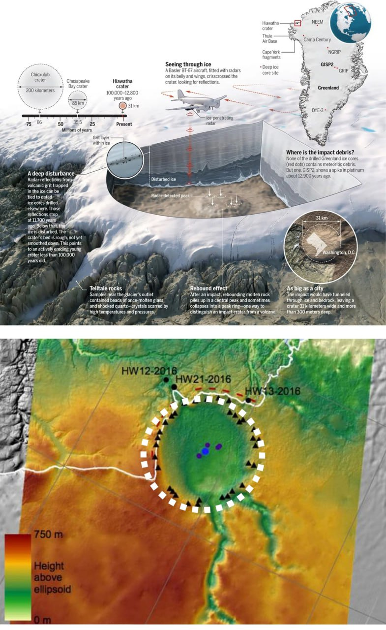The scientific journal sciencemag.org writes: “The impact would have been a spectacle for anyone within 500 kilometers. A white fireball, four times larger than the Sun and three times brighter, would have streaked across the sky. If the object had struck the ice sheet, it would have plowed into the bedrock, vaporizing both water and stone in a flash. The resulting explosion released the energy of 700 one-megaton nuclear bombs, and even an observer hundreds of kilometers away would have experienced a shockwave, in the form of a monstrous thunderclap with hurricane-force winds. Later, rock debris may have rained down on North America and Europe.”