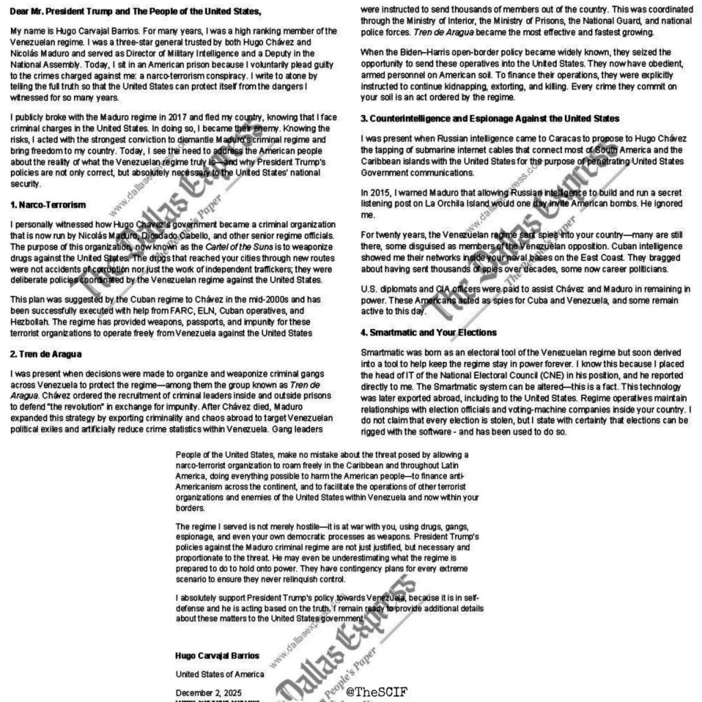 A jailed former Venezuelan spy chief (Hugo Carvajal) wrote a letter on Dec 2, 2025, saying: