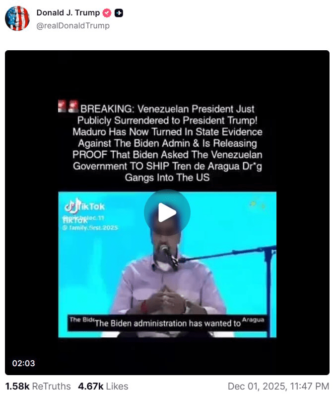 Trump posts a video on TS of Maduro saying that he has turned state’s evidence, revealing that “Biden” asked the Venezuelan govt to ship drugs and gang members (TDA) into the US