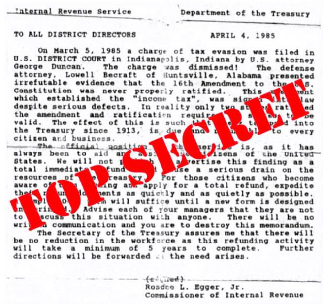 A CONFIDENTIAL 1985 letter from a sitting IRS Commissioner just confirmed what we’ve been screaming for DECADES: THE 16TH AMENDMENT WAS NEVER LEGALLY RATIFIED.