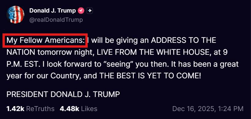 💥President Trump’s Truth starts off with “My fellow Americans: I will be giving an ADDRESS TO THE NATION tomorrow night, LIVE FROM THE WHITE HOUSE, at 9 P.M. EST”