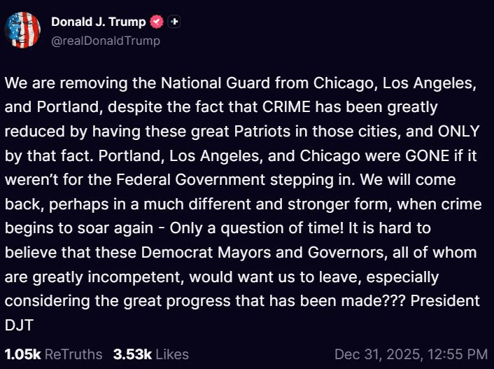 Trump just said he is removing the National Guard from Chicago, LA, and Portland, but says “we will come back, perhaps in a much different and stronger form”.
